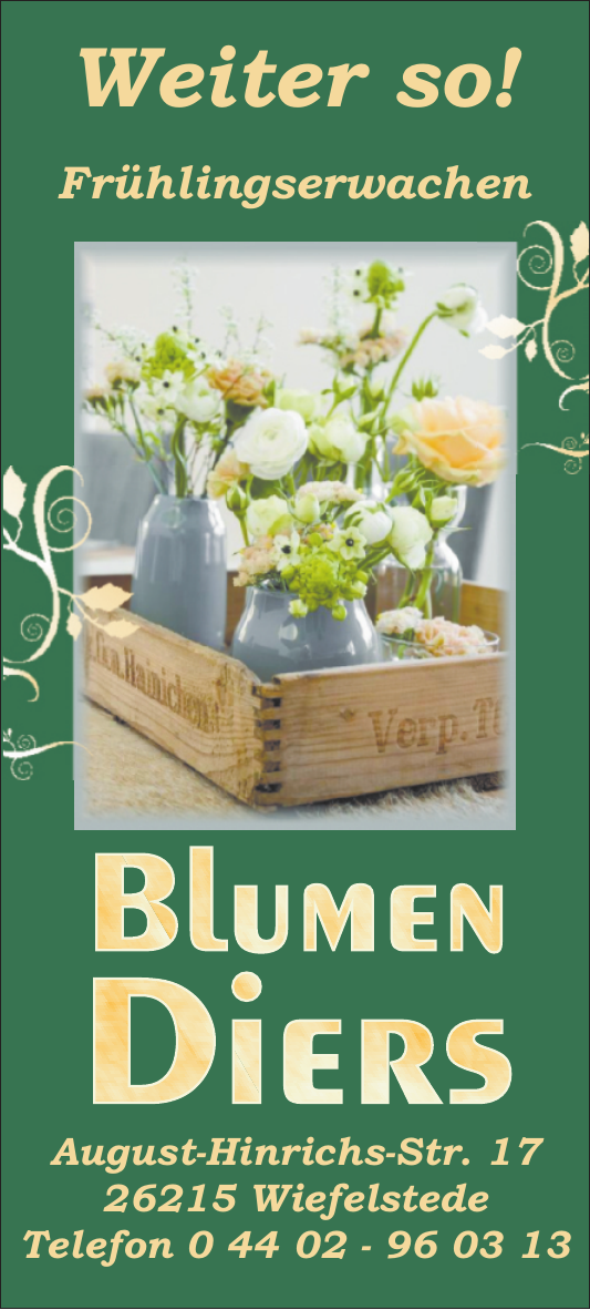 Blumen Diers setzt seit über 20 Jahren auf die Ausbildung von Floristinnen und Floristen und ist als regionaler Experte für Blumen, Pflanzen und Gedenkkultur bekannt. Das Unternehmen überzeugt durch persönliche Beratung, langjährige Erfahrung und ein breites Angebot aus einer Hand. Mit dem Leitspruch „Wir bringen Ideen zum Blühen!“ unterstreicht die Gärtnerei ihre Verbundenheit zur Region und ihren Anspruch, für jeden Anlass die passende florale Lösung zu bieten.