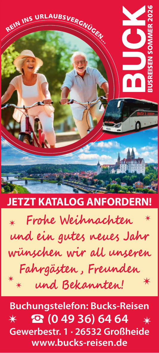 Bucks Reisen bietet komfortable Busreisen im erstklassigen Nichtraucher-Reisebus zu verschiedenen Zielen in Deutschland und Europa an. Die Reisen umfassen meist Übernachtungen in ausgewählten Hotels, inklusive Verpflegung, Ausflüge und Freizeitaktivitäten, wie z.B. in den Harz, Rügen oder Österreich.