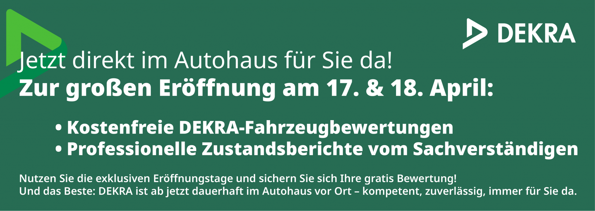 Als international agierender Experte für Sicherheit und Nachhaltigkeit bietet DEKRA ein umfassendes Portfolio an Prüf-, Bewertungs- und Zertifizierungsleistungen. Die Angebote richten sich an Privatpersonen sowie Unternehmen und setzen einen besonderen Schwerpunkt auf Sicherheit im Straßenverkehr, am Arbeitsplatz und im häuslichen Umfeld. Mit dem Leitsatz „Alles im grünen Bereich“ verdeutlicht DEKRA die zentrale Bedeutung von Vertrauen und Sicherheit in allen Lebensbereichen.