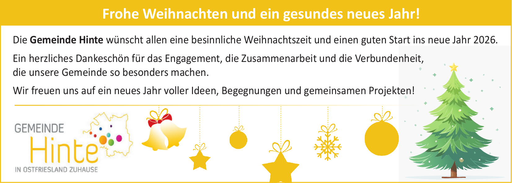Das Standesamt der Gemeinde Hinte ermöglicht Trauungen in der alten, romantischen Mühle von Hinte (Nutzungsgebühr 200,00 Euro) sowie Trauungen in den Rathausräumen. Die Standesbeamten informieren zu notwendigen Unterlagen und zum Ablauf; Trausamstage 2026: 9. Mai, 6. Juni, 4. Juli, 8. August.