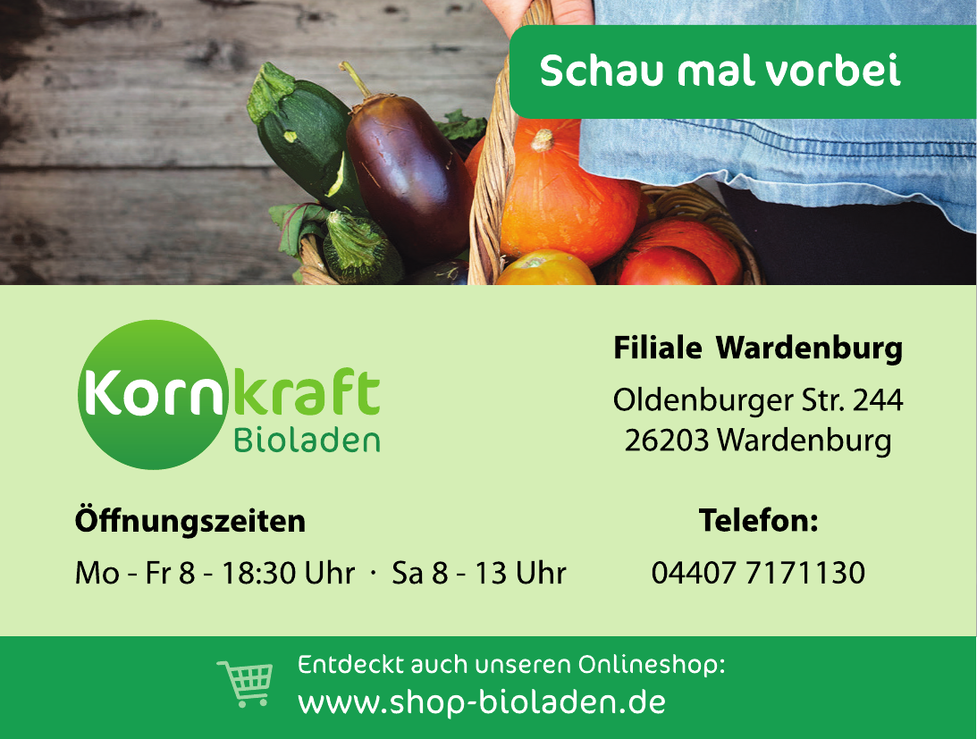 Als Teil einer regionalen Bio-Supermarktkette bietet Kornkraft Bioladen in Wardenburg ein umfangreiches Sortiment an hochwertigen, regionalen und fair gehandelten Bio-Lebensmitteln. Die Filiale legt besonderen Wert auf die Zusammenarbeit mit lokalen Erzeugern, was sich in der Initiative „BIO von hier“ widerspiegelt. Kundinnen und Kunden finden hier frisches Obst und Gemüse, Getreide, Milchprodukte, Käse, Fleisch, Wurst sowie Naturkosmetik – alles unter dem Aspekt der ökologischen Nachhaltigkeit.