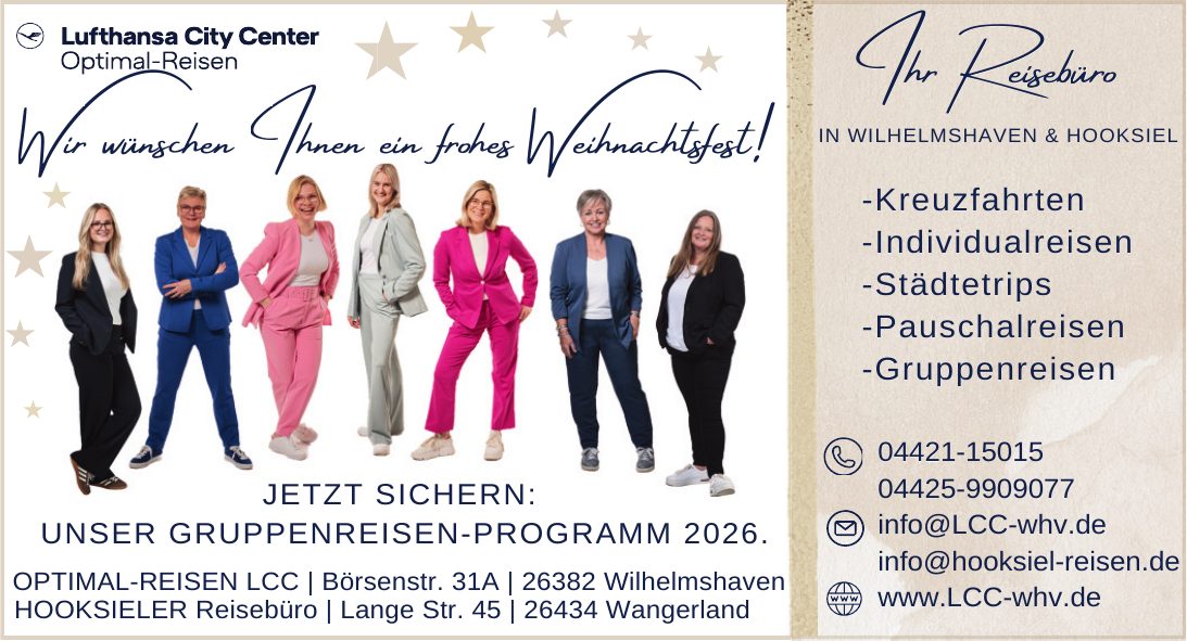 Optimal-Reisen Lufthansa City Center in Wilhelmshaven bietet eine Vielzahl von Dienstleistungen an, darunter Reiseberatung und Buchung für Urlaubs-, Geschäfts-, Individual- und Gruppenreisen sowie Kreuzfahrten.