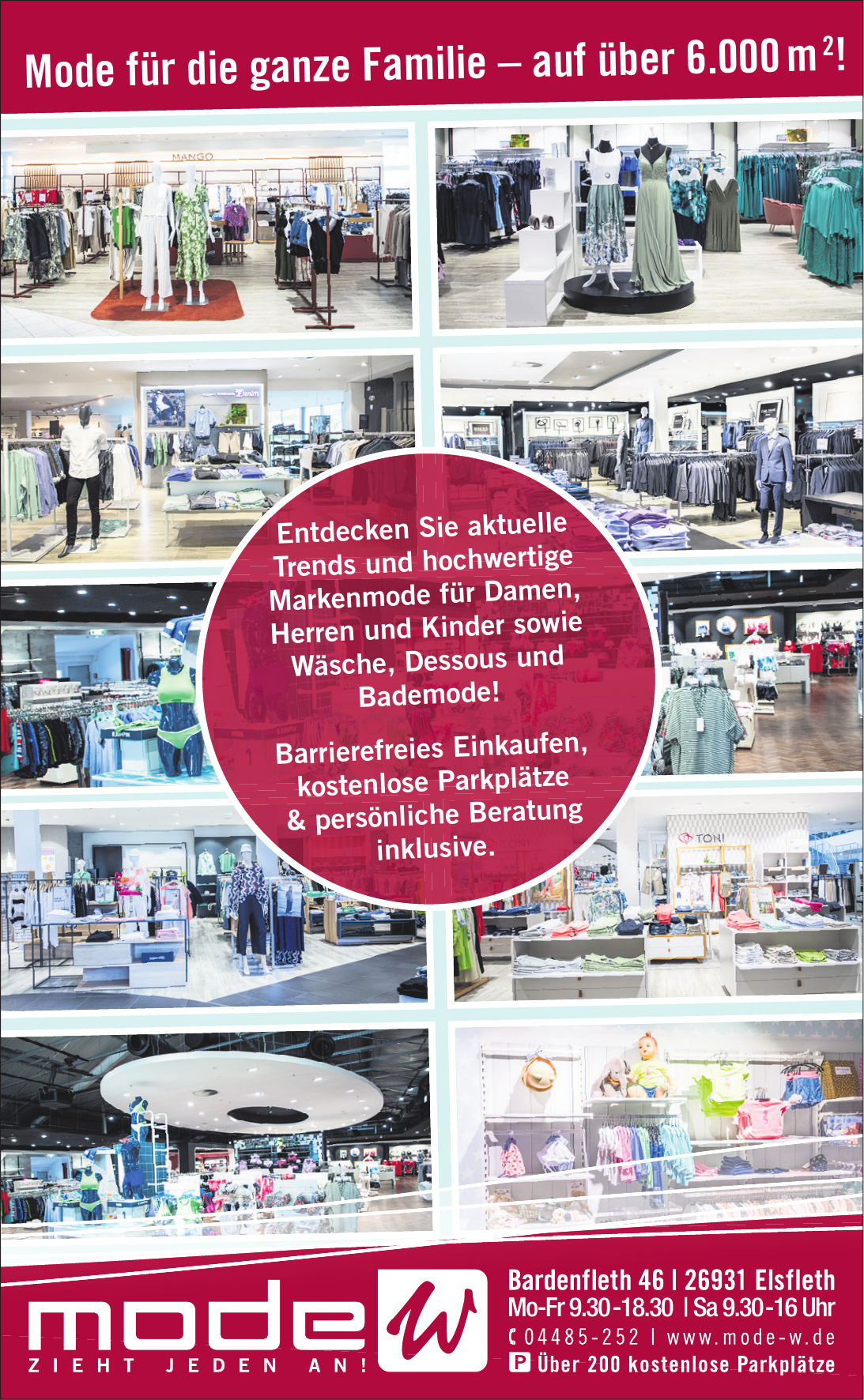 Modehaus Mode W, Karl Wessels GmbH & Co. KG bietet aktuelle Markenmode für fast jeden Anlass und jedes Alter. Als Modehaus für die ganze Familie führt Mode W Young Fashion, Kinder- und Babykleidung, Damen-‑ und Herrenbekleidung, Businesskleidung und Abendkleidung – und bietet eine große Größen-Auswahl. Auf über 6.000 m² Verkaufsfläche präsentiert Mode W regelmäßig Trends.