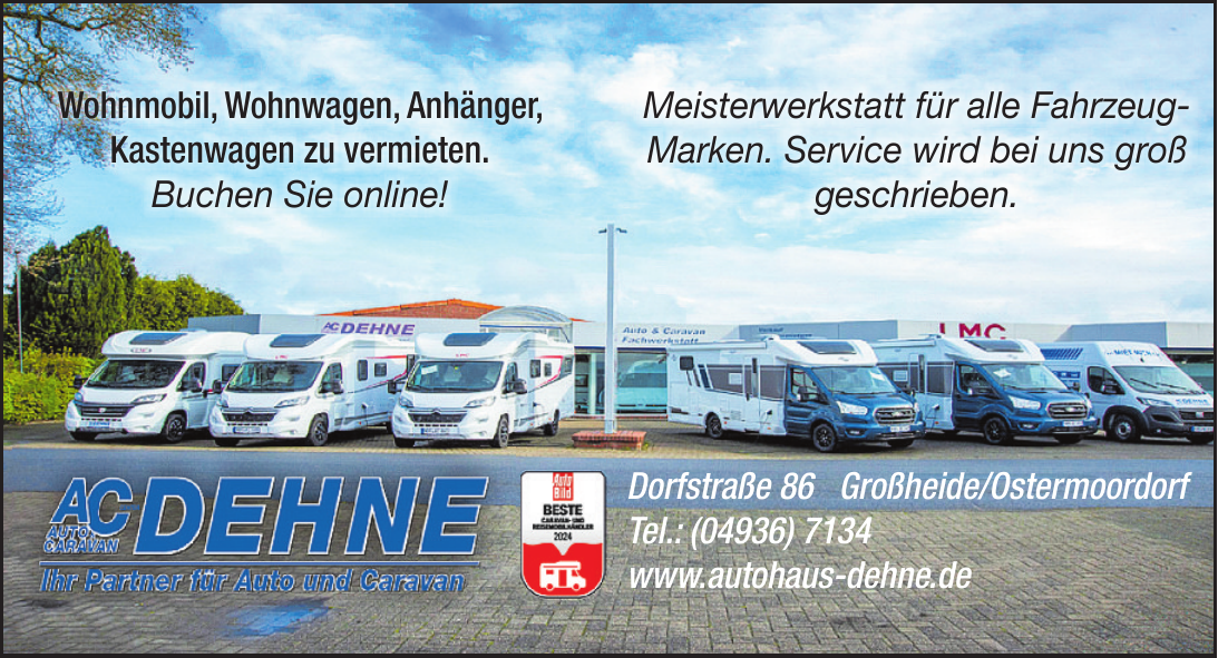 Autohaus Dehne verfügt über eine 800 m² große Fachwerkstatt mit 6 Hebebühnen, die Reparaturen, Unfall-, Hagel- und Wasserschäden, Haupt- und Abgasuntersuchungen, Gas- und Dichtigkeitsprüfungen, Auflastungen, Bremsenchecks sowie Arbeiten an Bordelektrik und Heiz- und Klimasystemen anbietet. Zudem ist das Unternehmen autorisierter Servicepartner für Marken wie LMC, Carado, Bürstner, Laika, La Strada und WM Meyer.