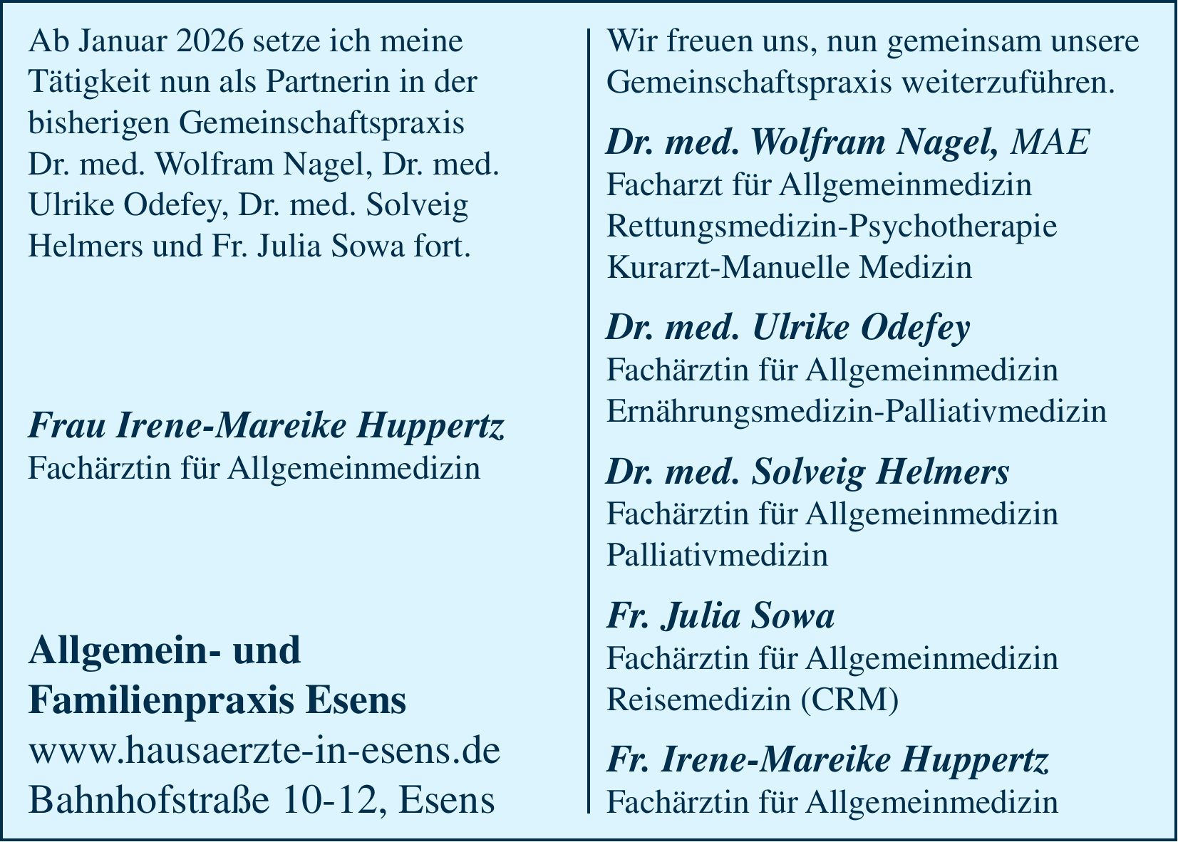 Ab Januar 2026 setze ich meine Tätigkeit nun als Partnerin in der bisherigen Gemeinschaftspraxis Dr. med. Wolfram Nagel, Dr. med. Ulrike Odefey, Dr. med. Solveig Helmers und Fr. Julia Sowa fort.