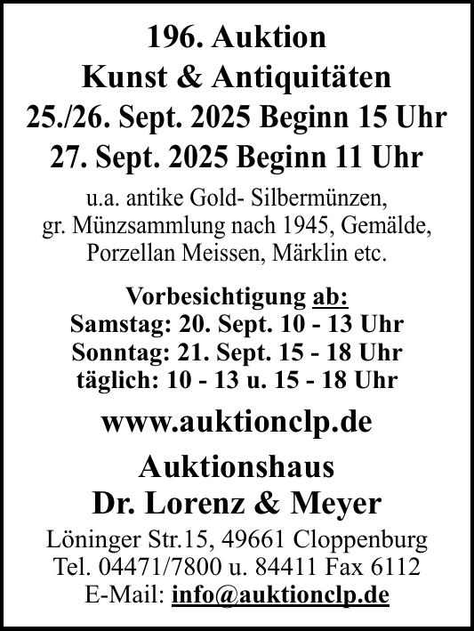 Das traditionsreiche Auktionshaus Dr. Lorenz & Meyer in Cloppenburg ist bekannt für seine abwechslungsreichen Auktionen. Unter der Leitung von Werner Meyer, einem öffentlich bestellten und vereidigten Auktionator, finden regelmäßig Versteigerungen statt, bei denen eine breite Auswahl an Gemälden, Skulpturen, Zeichnungen, Möbeln, Bronzen, Keramik, Porzellan, Glas, Uhren, Schmuck, Silber, Teppichen sowie Nachlässen und Sammlungen angeboten wird. Auch Spezialbereiche wie Militaria, Münzen, Medaillen, Briefmarken, asiatische und afrikanische Kunst sowie archäozoologische Objekte gehören zum umfangreichen Portfolio.