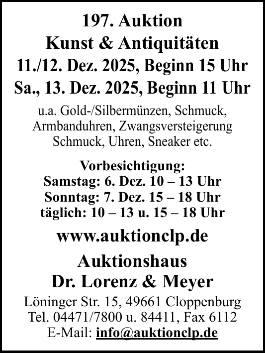 Das Auktionshaus Dr. Lorenz & Meyer mit Sitz in Cloppenburg ist spezialisiert auf die Durchführung von Auktionen und richtet regelmäßig Versteigerungen aus. Das Unternehmen präsentiert eine vielfältige Auswahl an antiken und sammlerischen Objekten, darunter Gemälde, Skulpturen, Zeichnungen, Aquarelle, Möbel, Bronzen, Keramik, Porzellan, Glas, Uhren, Schmuck, Silber, Teppiche, Nachlässe und komplette Sammlungen. Die angebotenen Stücke umfassen zahlreiche Kategorien wie Bücher, Militaria, Spielzeug, Grafik, Landkarten, Münzen, Medaillen, Banknoten, Briefmarken sowie religiöse Kunst und Zwangsversteigerungen.