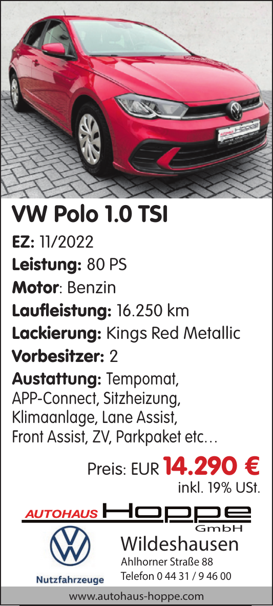 Das Autohaus Hoppe bietet eine große Auswahl an Gebrauchtwagen, Jahres- und Vorführwagen aller Marken auf über 1.000 Quadratmetern Ausstellungsfläche. Zudem umfasst das Angebot Nutzfahrzeuge, Spezialfahrzeuge für verschiedene Bereiche sowie E-Mobilitätsmodelle wie den ID.Buzz.