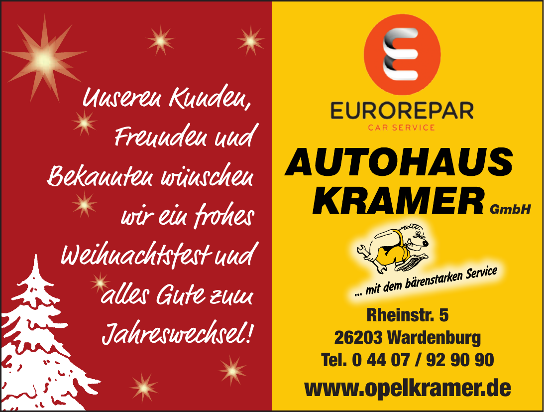 Autohaus Kramer GmbH in Wardenburg bietet Wartungs- und Reparaturdienste für Fahrzeuge an, darunter Ölwechsel, Inspektionen, Reifenservice, Bremsen, Klimaanlagen, Batterien, Sichtprüfung, Auspuff, Zahnriemen, Federung, Technikcheck, Mechanik und Karosseriearbeiten.
