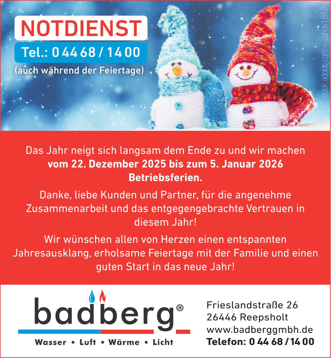 Badberg ist ein erfahrener Spezialist für Badgestaltung, Heizungsmodernisierung, Elektrotechnik und Wärmelösungen mit Sitz in Friedeburg / Reepsholt. Seit 1990 betreut das Unternehmen Kundinnen und Kunden in ganz Ostfriesland und bietet individuelle Beratung von der Planung bis zur Umsetzung. Das Team legt besonderen Wert auf maßgeschneiderte Betreuung und begleitet jedes Projekt persönlich und kompetent.