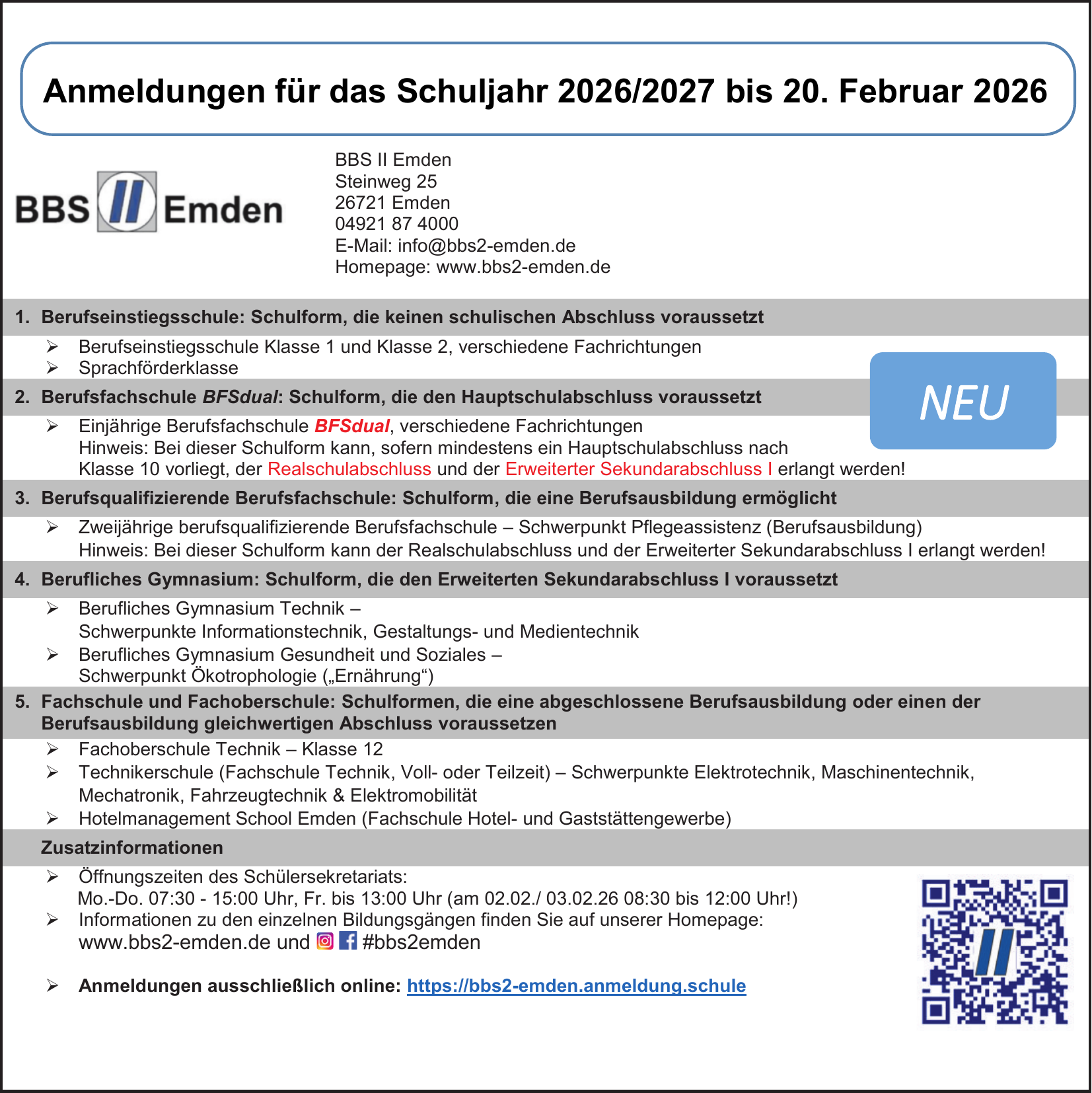 Die BBS II Emden ist eine renommierte Bildungseinrichtung im Herzen von Emden. Sie richtet sich an Jugendliche und junge Erwachsene, die ihre schulische und berufliche Zukunft aktiv gestalten möchten. Das Angebot reicht von allgemeinbildenden Abschlüssen wie Haupt- und Realschulabschluss sowie erweitertem Sekundarabschluss I bis hin zur beruflichen Grundbildung im Rahmen der dualen Ausbildung.