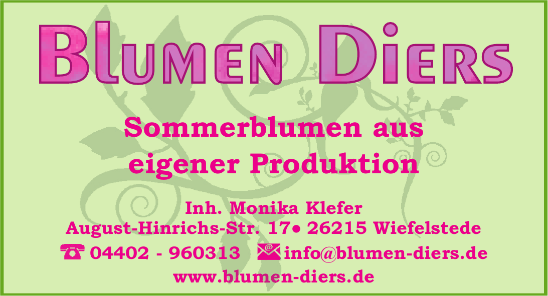 Seit 1929 steht das Familienunternehmen Blumen Diers für Gartenbau, Floristik und Grabpflege in der Region Wiefelstede. In vierter Generation geführt, entwickelte sich die einst kleine Gärtnerei zu einem umfassenden Anbieter für Zierpflanzen, Baumschule, Floristik und Serviceleistungen rund um Garten- und Pflanzenbedarf. Das Sortiment reicht von saisonalen und ganzjährigen Pflanzen über Zimmerpflanzen bis hin zu wetterbeständigen Pflanzgefäßen aus Glasfaser oder Kunststoff in verschiedenen Designs. Individuelle Beratung unterstützt Kundinnen und Kunden dabei, die passenden Lösungen für Garten, Terrasse oder Innenräume zu finden.