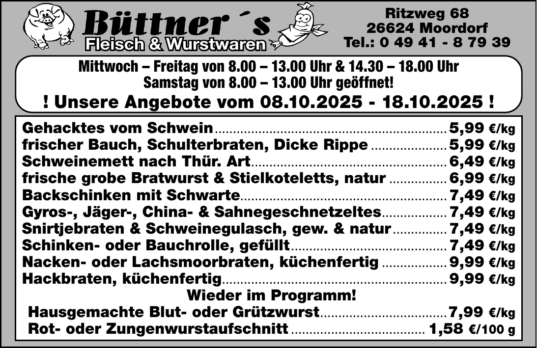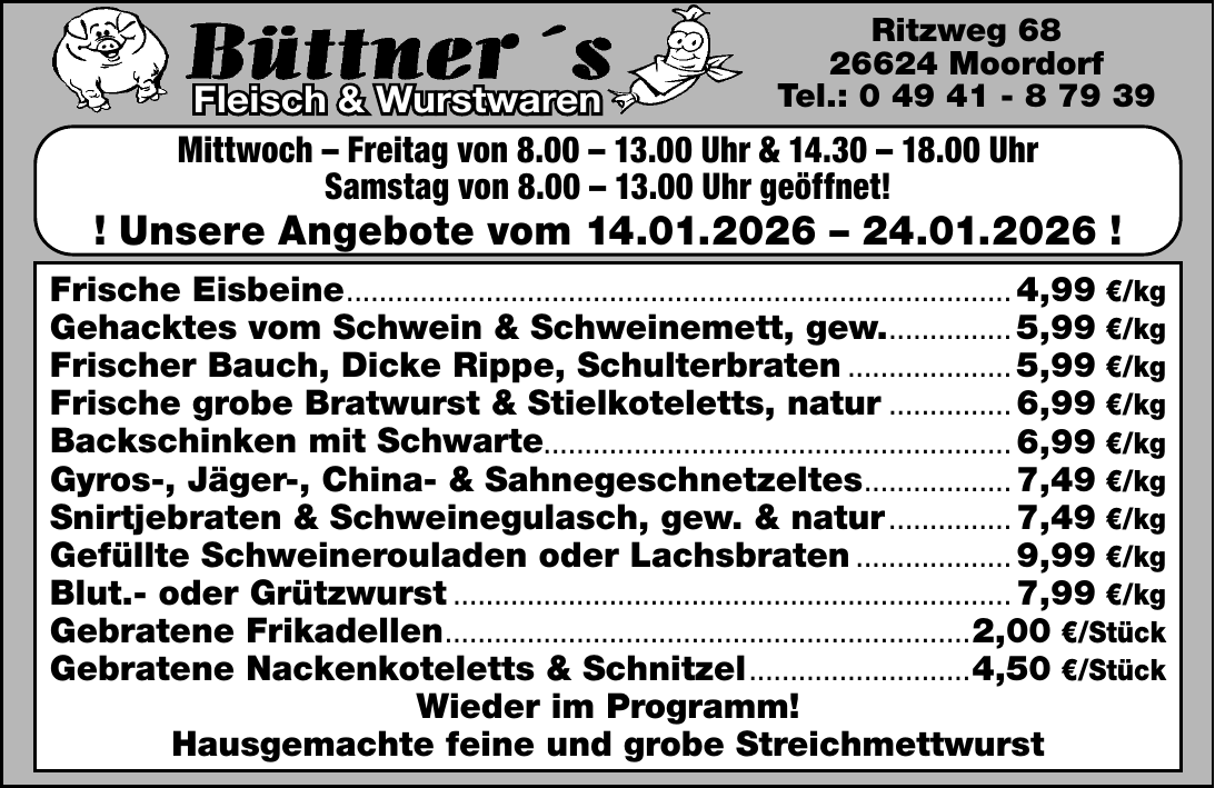 Bestellungen bei Büttner's Fleisch & Wurstwaren sind nur unter der angegebenen Telefonnummer möglich.