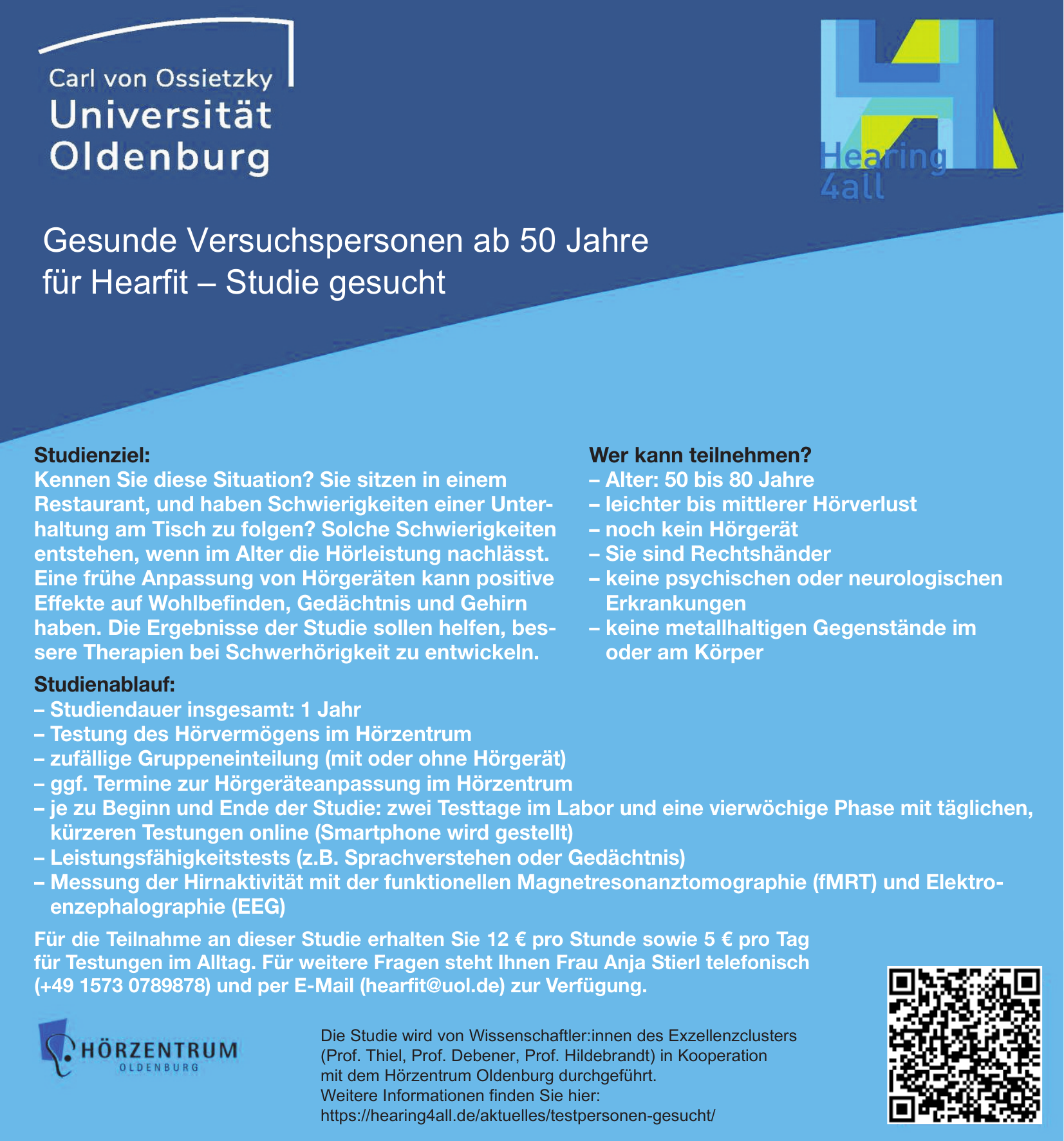 Die Universität Oldenburg ist Teil eines breit aufgestellten Netzwerks, das neben der Medizinischen Hochschule Hannover auch Partner wie die Jade Hochschule, das Fraunhofer IDMT und weitere wissenschaftliche Einrichtungen umfasst. Diese interdisziplinäre Zusammenarbeit ermöglicht eine ganzheitliche Betrachtung des Themas Hören und stärkt die wissenschaftliche wie praktische Kompetenz im Bereich der Hörakustik. Für Mitglieder stellt die Universität zudem Präsentations- und Postervorlagen sowie Kommunikationsmittel bereit, um eine einheitliche Außendarstellung zu gewährleisten.