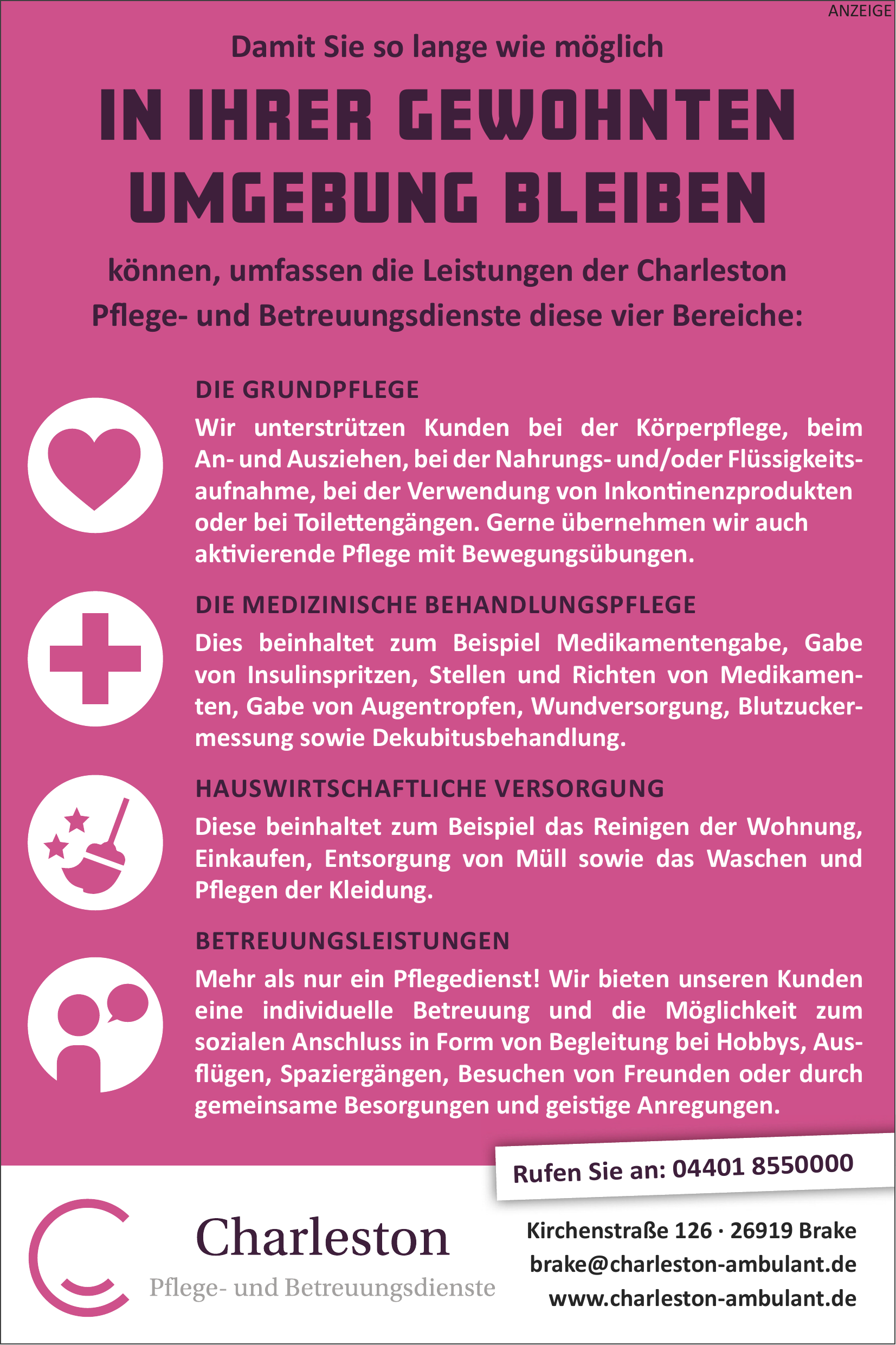 Charleston Ambulante Dienste bietet ambulante Pflege, ambulante Intensivpflege sowie Pflege- und Betreuungsdienste an, um die gewohnte Umgebung älteren Menschen zu erhalten und sie individuell zu betreuen.