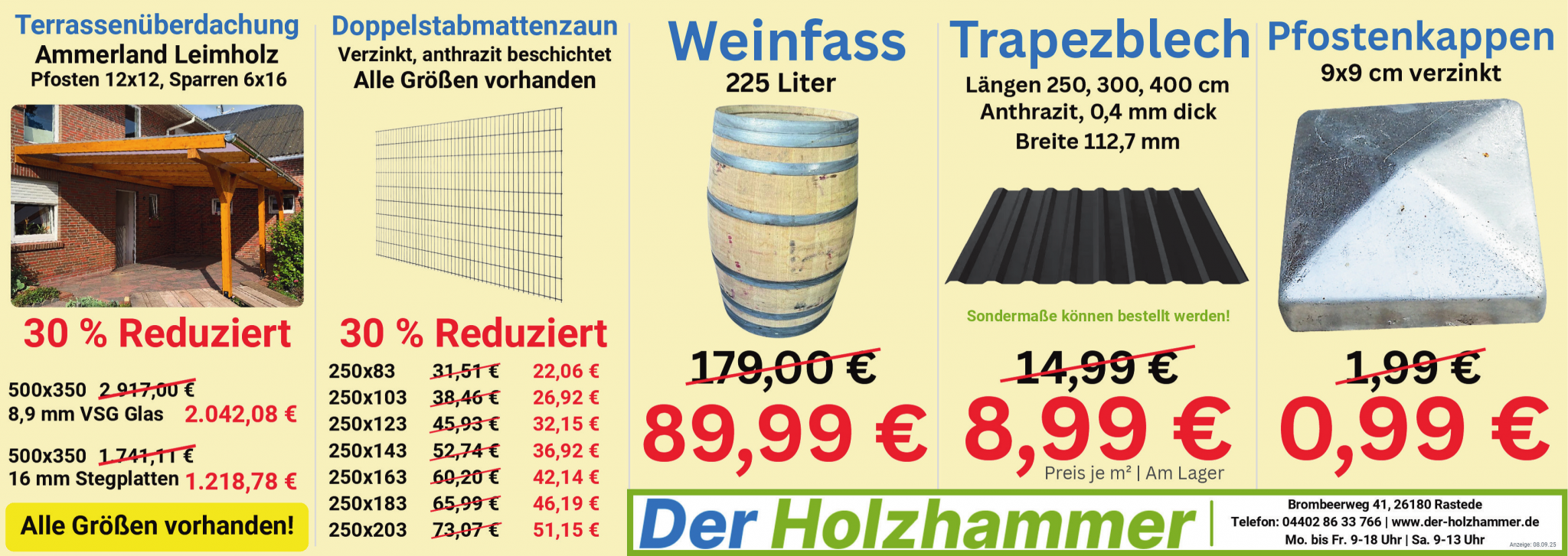 Der Holzhammer bietet eine große Auswahl an Produkten für den Garten, darunter Terrassenüberdachungen, Carports, Gartenhäuser, Kinderspielecke, Gartenmöbel, Gartenholz, Holzzäune, Metallzäune, WPC Zäune, Terrassenböden, Hochbeete, Pflanzkästen, Zubehör, Restposten und Dachmaterial. Das Unternehmen berät auch fachmännisch und bietet einen Abholmarkt sowie eine umfangreiche Produktpalette.