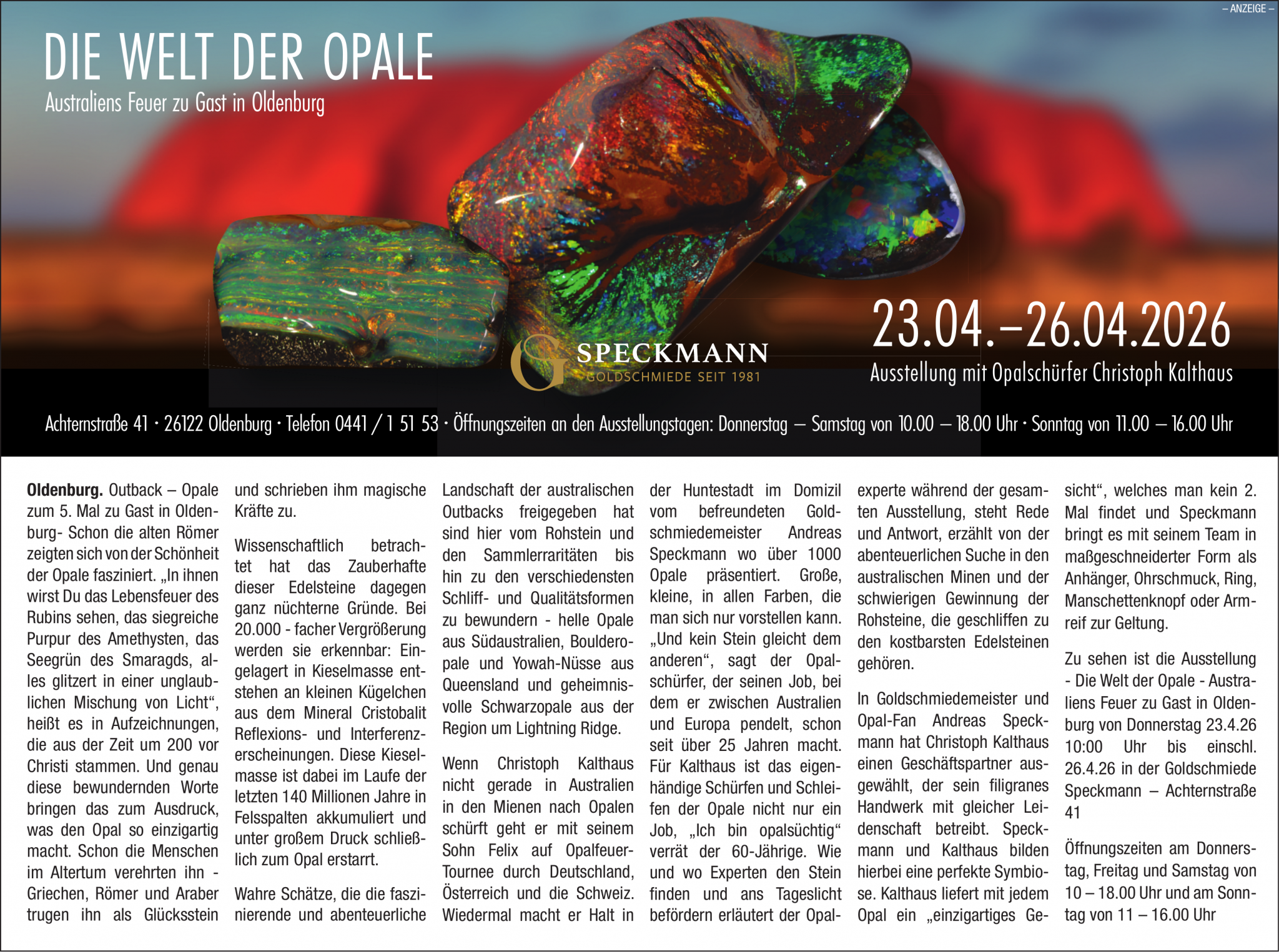Die Goldschmiede Speckmann bietet nach eigenen Angaben Anfertigungen von Schmuck sowie Restaurationen, Umarbeitungen und Reparaturen. Es gibt Trauringe, Verlobungsringe, Siegelringe, Altgoldverarbeitung, Expertisen & Gutachten sowie dazugehörige Reparaturen. Der Betrieb hebt zudem Individuelles Unikat-Design und individuelle Beratung hervor.