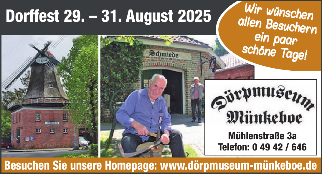 Im Dörpmuseum Münkeboe sind Werkstätten, Einrichtungen, Geräte und Maschinen aus einem kleinen Moorranddorf zusammengetragen, darunter eine voll funktionsfähige Kornwindmühle, eine Schmiede, Stellmacherei, Sägewerk, Tante-Emma-Laden mit Bäckerei, Feldbackofen, Dorfschule, Kolonistenhaus mit Blaufärberei und Druckerei sowie eine Gulfhofanlage für Landmaschinen.