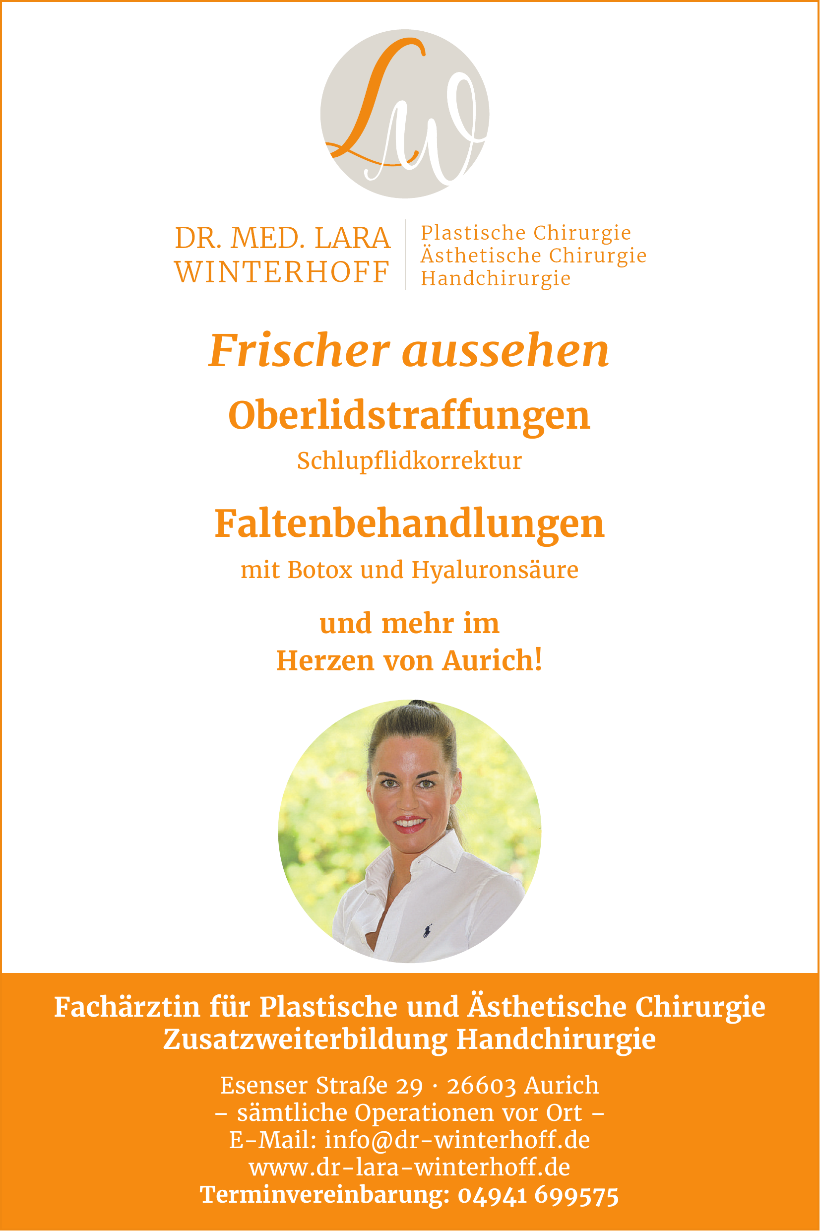 Dr. Lara Winterhoff bietet in ihrer Praxis in Aurich vielfältige kosmetische und plastisch-ästhetische Behandlungen an, darunter Faltenbehandlungen mit Botox, Hyaluronsäure und Eigenfett, Lidstraffungen, Brustvergrößerungen mittels Eigenfetttransplantation, Narbenkorrekturen, Fettabsaugungen sowie Straffungsoperationen am ganzen Körper.