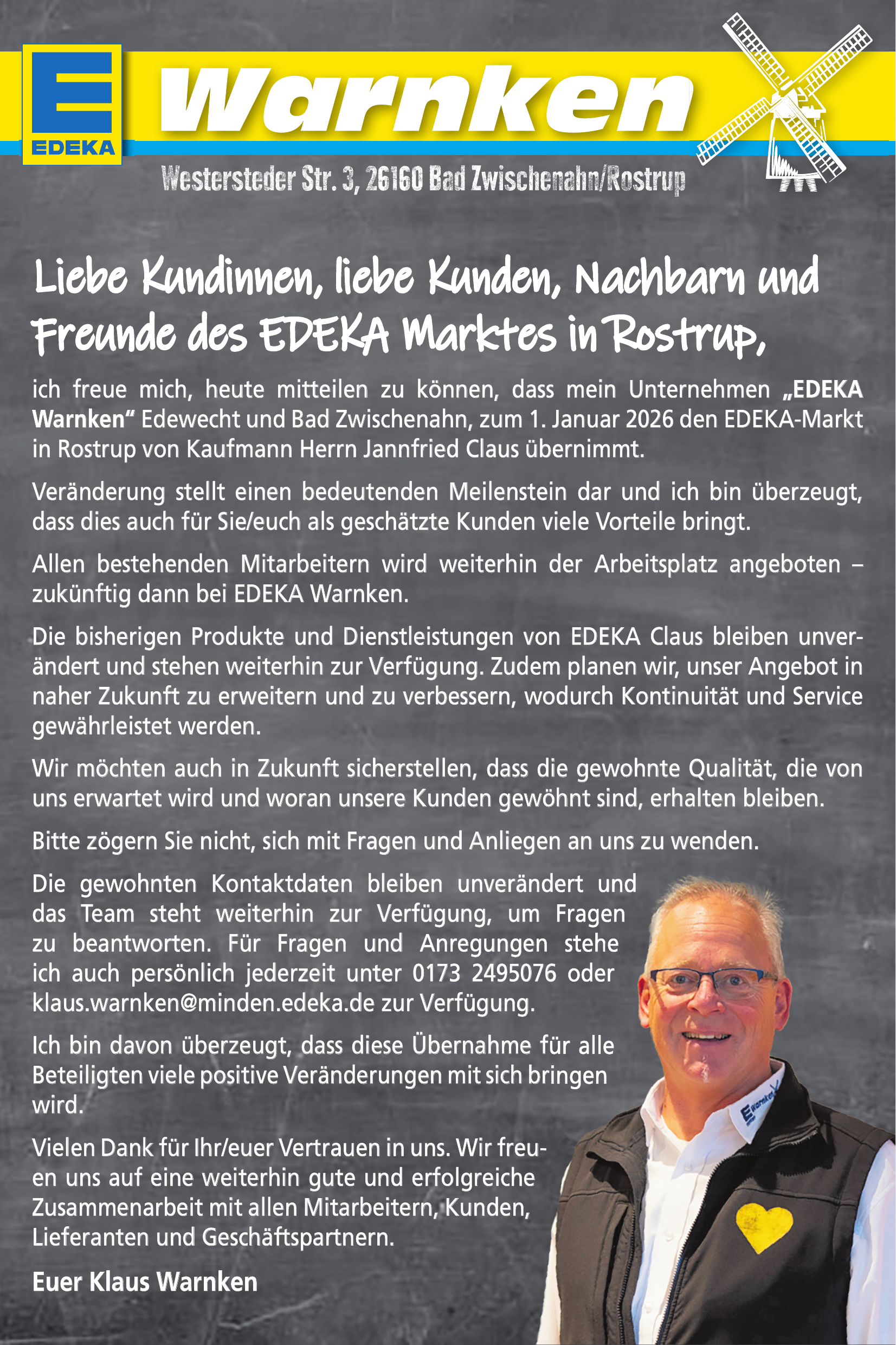 ich freue mich, heute mitteilen zu können, dass mein Unternehmen „EDEKA Warnken“ Edewecht und Bad Zwischenahn, zum 1. Januar 2026 den EDEKA-Markt in Rostrup von Kaufmann Herrn Jannfried Claus übernimmt.
