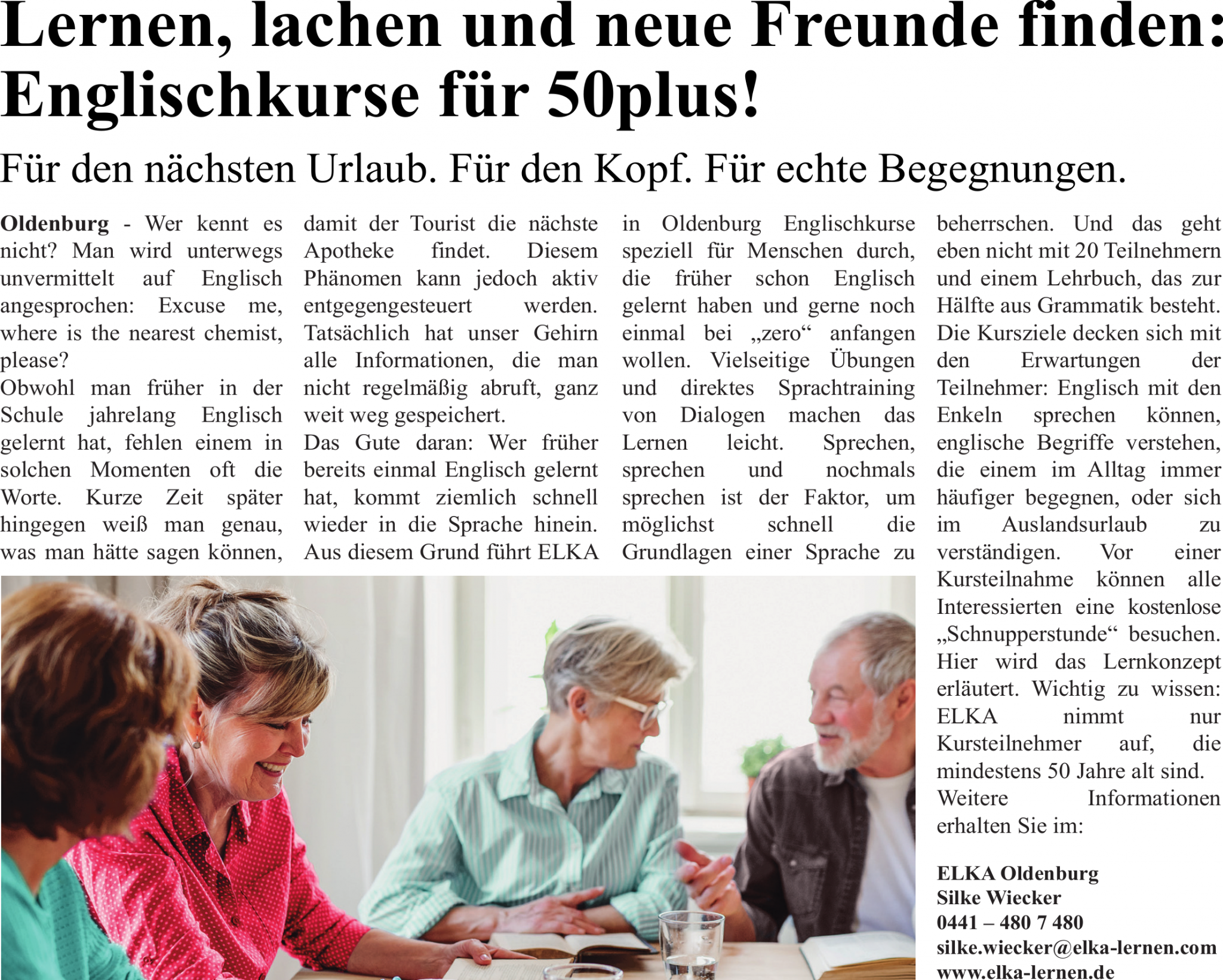ELKA bietet Sprachkurse in Englisch, Französisch und Spanisch für Senioren ab 50 Jahren an. Die Kurse finden in kleinen Gruppen mit maximal 10 Teilnehmern statt und legen besonderen Wert auf Sprechen und Hören, wobei Grammatik nur bei Bedarf behandelt wird.