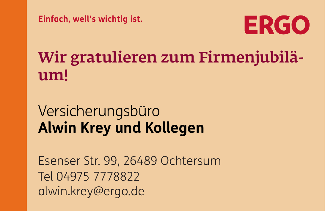Unter dem Motto „Nicht alles im Leben ist einfach. Aber versichern.“ präsentiert sich die ERGO Versicherung Horst Peters als vertrauenswürdiger Ansprechpartner für alle Fragen rund um Versicherung und Vorsorge. Die Agentur ist fest in Ochtersum und Umgebung verwurzelt und bietet direkten, persönlichen Kontakt zu ihren Kundinnen und Kunden.