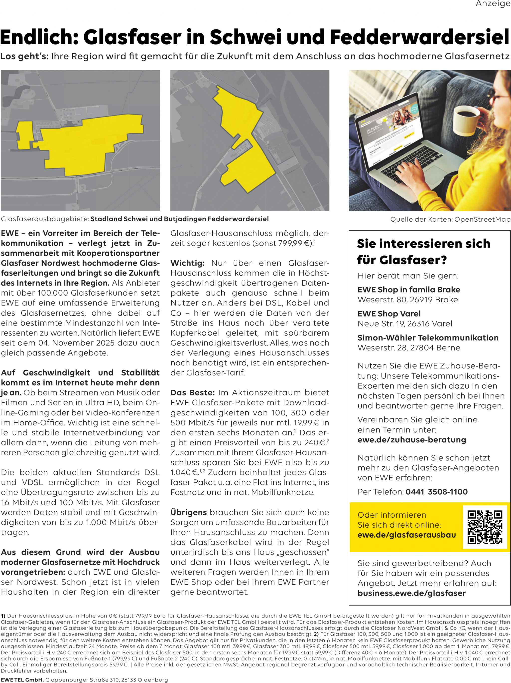 Aus diesem Grund wird der Ausbau moderner Glasfasernetze mit Hochdruck vorangetrieben: durch EWE und Glasfaser Nordwest. Schon jetzt ist in vielen Haushalten in der Region ein direkter Glasfaser-Hausanschluss möglich, derzeit sogar kostenlos (sonst 799,99 €).¹