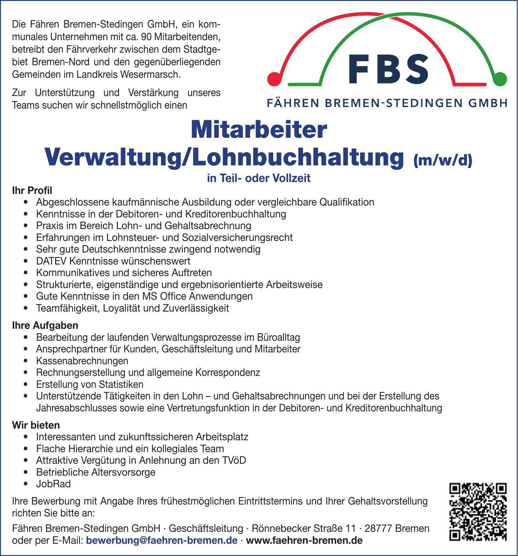 Fähren Bremen-Stedingen GmbH betreibt Fährverbindungen zwischen dem Stadtgebiet Bremen-Nord und niedersächsischen Gemeinden im Landkreis Wesermarsch. Die Strecken sind Vegesack–Lemwerder, Lemwerder–Vegesack, Blumenthal–Motzen, Motzen–Blumenthal, Farge–Berne und Berne–Farge.