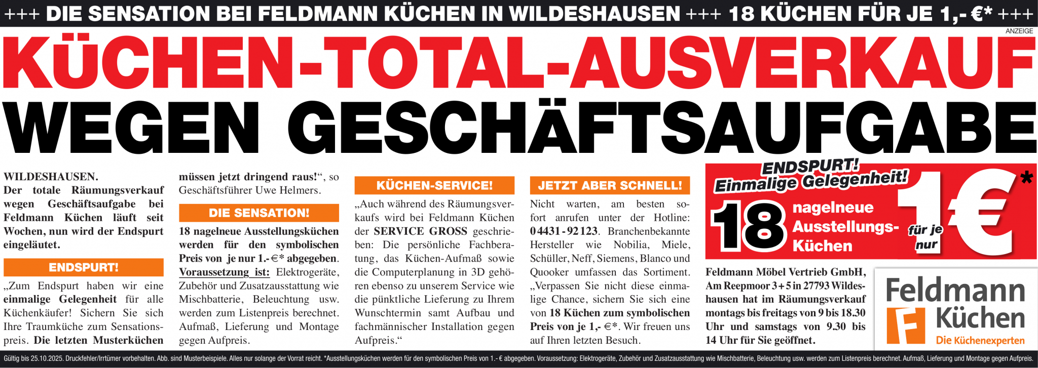 Das Unternehmen Feldmann Küchen Wildeshausen schließt das Küchenstudio aus Altersgründen; eine Ära geht zu Ende. Die Schlussphase läuft unter dem Motto 'ALLES MUSS JETZT RAUS!'.