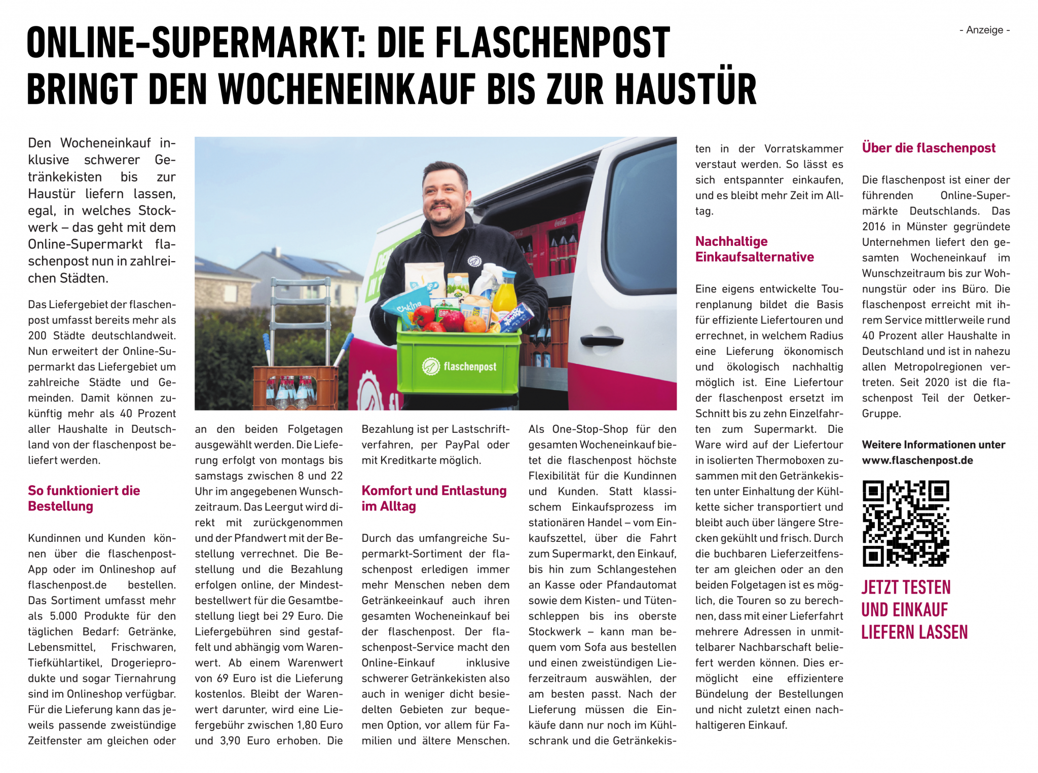 Die flaschenpost ist einer der führenden Online-Supermärkte Deutschlands. Das 2016 in Münster gegründete Unternehmen liefert den gesamten Wochenkauf im Wunschzeitraum bis zur Haustür oder ins Büro. Die flaschenpost erreicht mit ihrem Service mittlerweile rund 40 Prozent aller Haushalte in Deutschland und ist in nahezu allen Metropolregionen vertreten. Seit 2020 ist die flaschenpost Teil der Oetker-Gruppe.