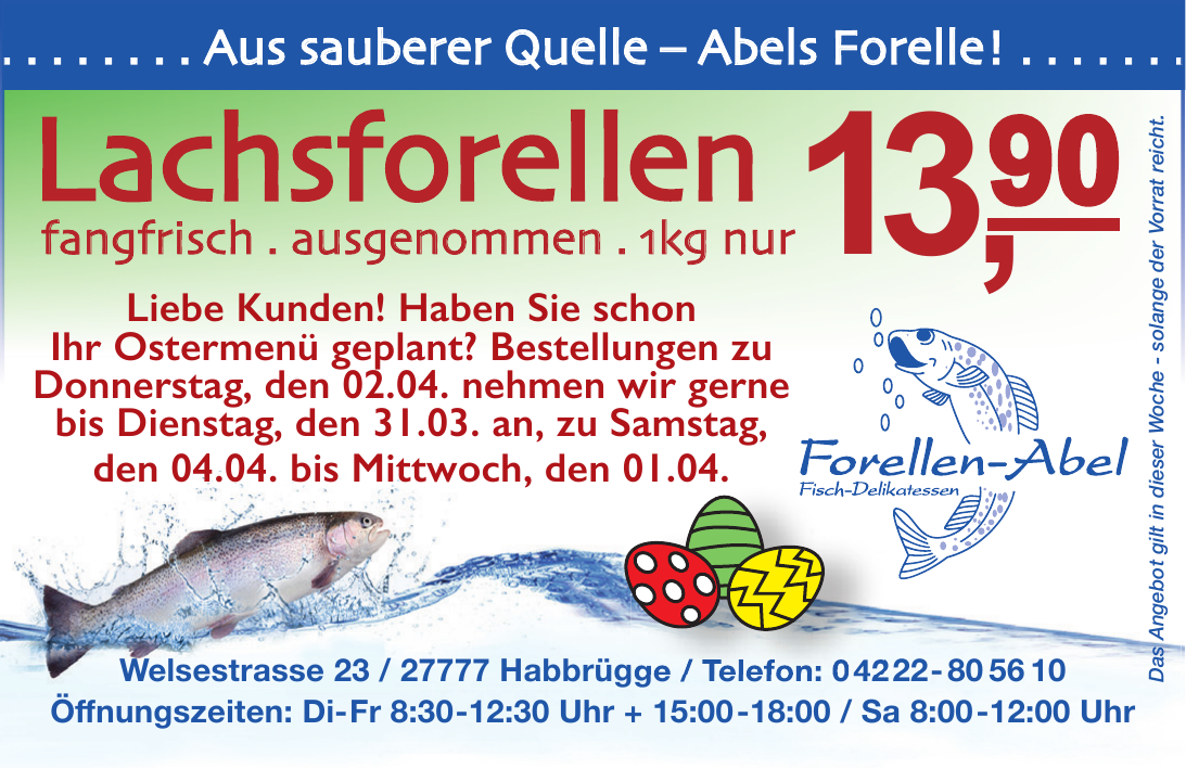 Forellen-Abel ist Deutschlands größter Verarbeiter von Lebendfisch und beliefert den Großhandel, verkauft aber auch im Einzelhandel in ihrem Geschäft in Ganderkesee/Habbrügge bei Bremen.