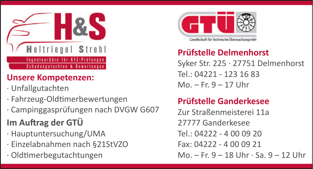 Die GTÜ KFZ-Prüfstelle Heltriegel Strehl ist auf umfassende Dienstleistungen rund um das Kraftfahrzeug spezialisiert. Als erfahrener Vertragspartner der GTÜ führt die Prüfstelle amtliche Fahrzeuguntersuchungen wie Hauptuntersuchung (HU) und Abgasuntersuchung (AU) durch. Zum Leistungsspektrum gehören außerdem Unfall- und Schadensgutachten, Oldtimerbewertungen sowie spezielle Prüfungen wie Campinggasprüfungen (G 607) und Einzelabnahmen nach §21 StVZO. Auch amtliche Dienstleistungen nach BO Kraft sowie gutachterliche und sicherheitsbezogene Prüfungen werden angeboten.