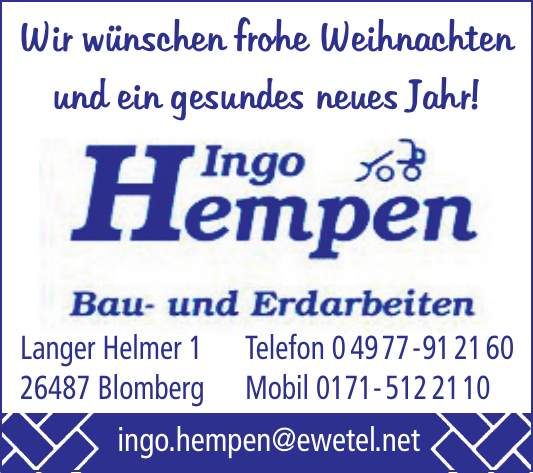 Hempen Ingo Bau- u. Erdarbeiten spezialisiert sich auf Bau- und Erdarbeiten, um bei Bauprojekten eine solide Grundlage zu schaffen. Genauere Details zu den angebotenen Leistungen sind auf der Website jedoch nicht angegeben.