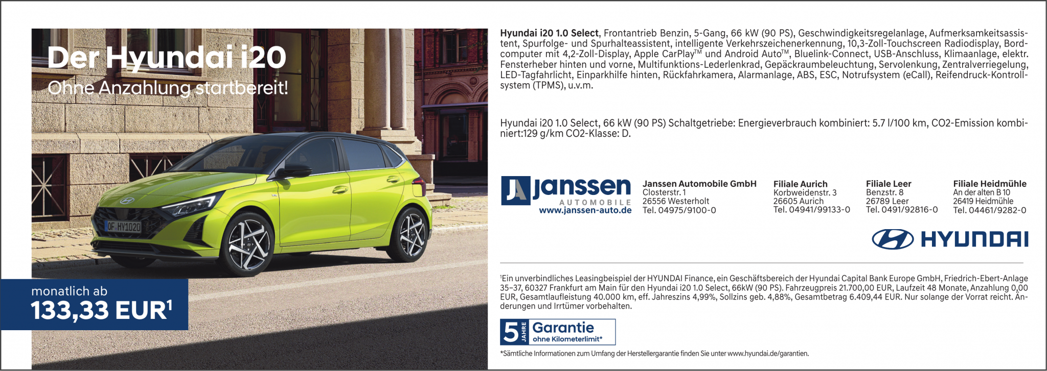 ¹Ein unverbindliches Finanzierungsbeispiel der HYUNDAI Finance, ein Geschäftsbereich der Hyundai Capital Bank Europe GmbH, Friedrich-Ebert-Anlage 35-37, 60327 Frankfurt am Main für den Hyundai TUCSON 1.6 T-GDI HEV 6-AT 2WD N Line, 176 kW (239 PS). Fahrzeugpreis 35.290,00 EUR, Anzahlung 3.300,00 EUR, Schlussrate 27.804,00 EUR, eff. Jahreszins 4,59%, Sollzins (geb.) 4,50 %, Laufzeit 48 Monate, Gesamtlaufleistung 40.000 km, Gesamtbetrag 37.385,76 EUR, inkl. Überführung. Nur solange der Vorrat reicht. Änderungen/Irrtümer vorbehalten.