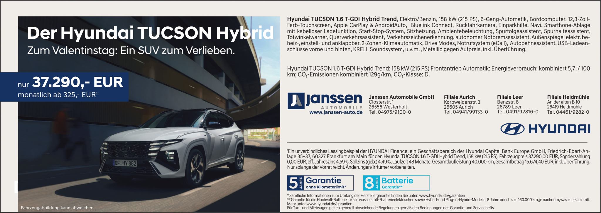 Hyundai TUCSON 1.6 T-GDI Hybrid Trend: 158 kW (215 PS) Frontantrieb Automatik: Energieverbrauch: kombiniert 5,7 l/100 km; CO₂-Emissionen kombiniert 129 g/km, CO₂-Klasse: D.