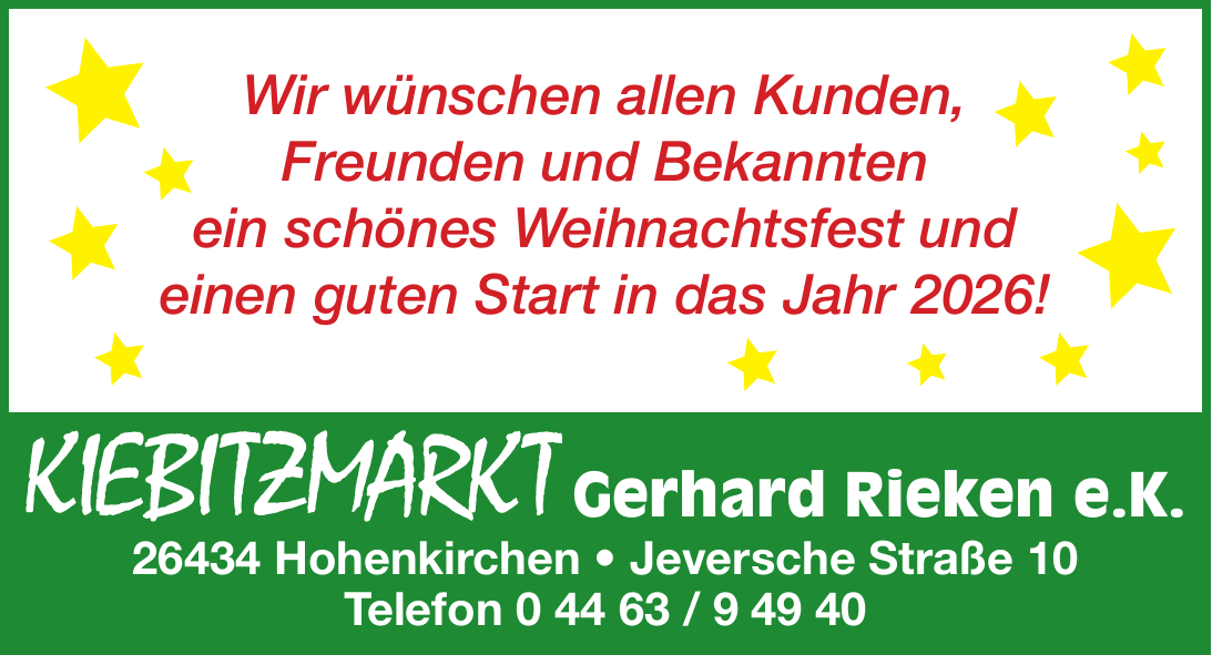 Kiebitzmarkt Gerhard Rieken e.K. ist in Hohenkirchen tätig und bedient die umliegenden Regionen, wie auf der Webseite angegeben.
