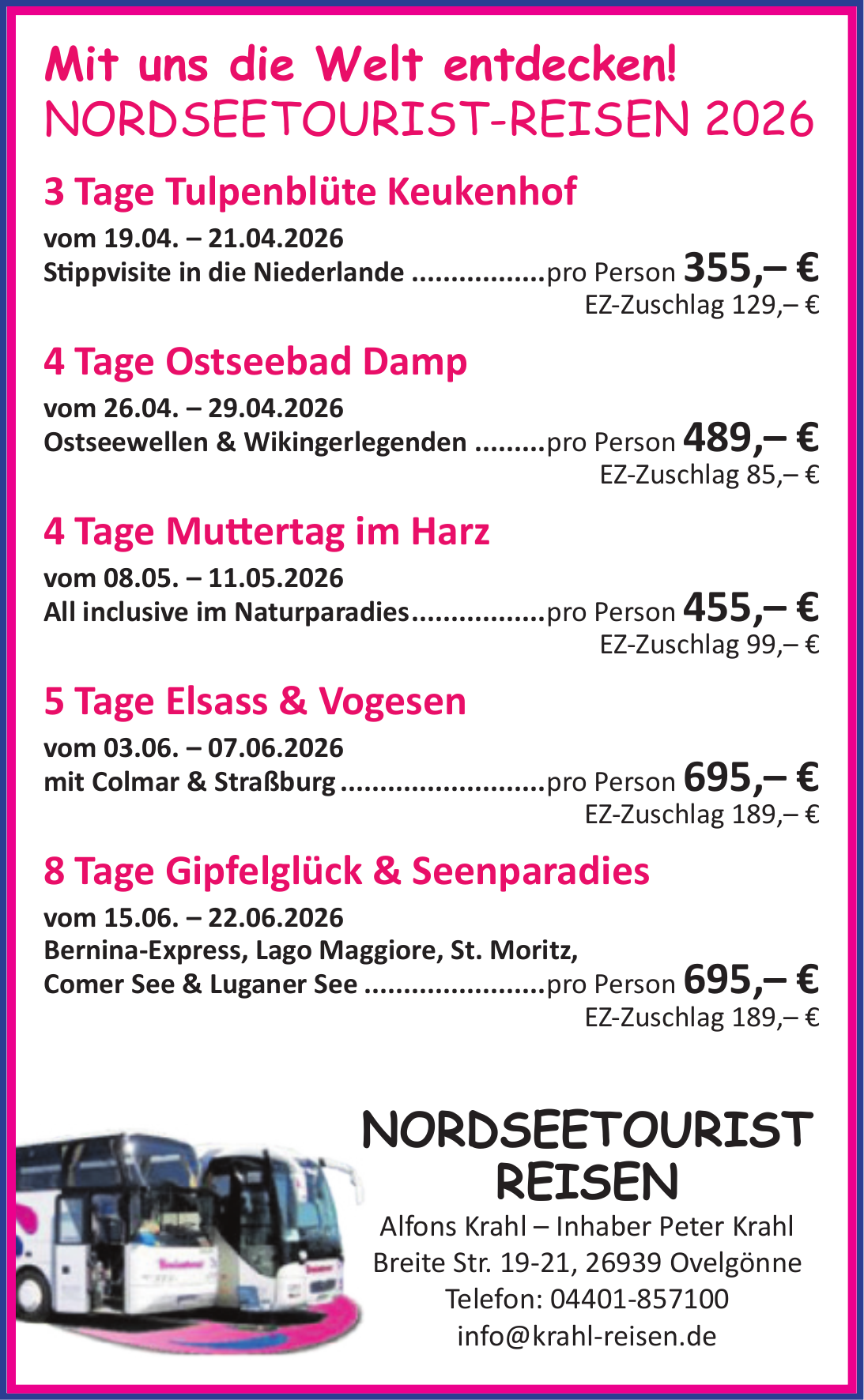 Krahl Reisen bietet maßgeschneiderte Reiseangebote, die individuell auf die Bedürfnisse und Wünsche der Kunden abgestimmt sind. Dazu gehören Busreisen, Urlaubsreisen, Eventreisen und Städtereisen.