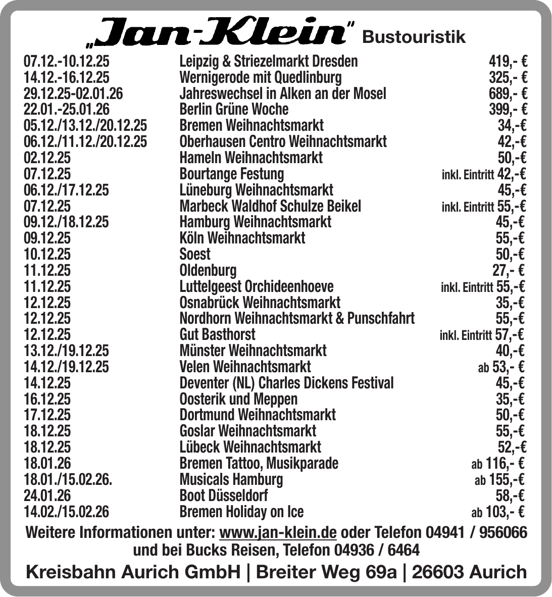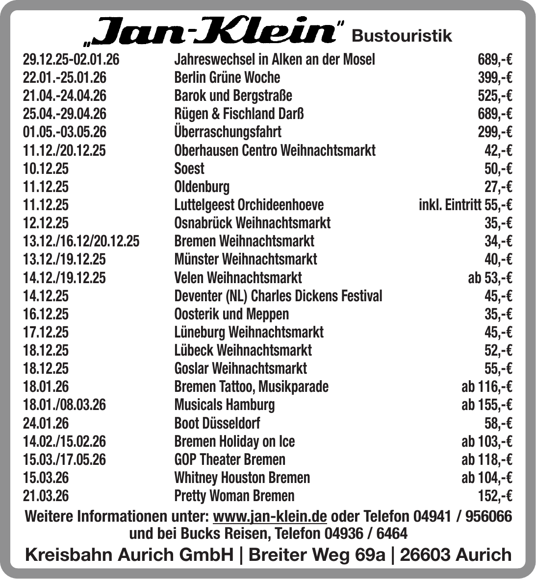 Die Fahrplanauskunft kann online über die Webseite der Kreisbahn Aurich genutzt werden, wo Sie Start- und Zielort sowie Abfahrtszeit eingeben können. Alternativ steht eine telefonische Fahrplanauskunft unter der Nummer 04941/93377 zur Verfügung.