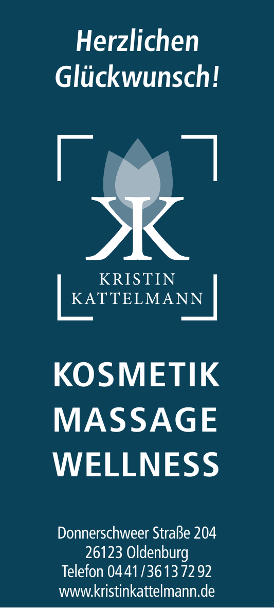 Kristin Kattelmann Entspannung Gesundheit Schönheit Vitalität führt ein Kosmetikstudio in Oldenburg, in dem Sie bei einer individuellen Kosmetikbehandlung oder einer Massage dem Alltag entfliehen können. Jede Behandlung beginnt mit einer kurzen Hautanalyse, danach folgen Tiefenreinigung, Peeling, eine entspannende Gesichtsbehandlung, eine wirkstoffreiche Spezialmaske und eine Augenbrauenkorrektur. Im Gespräch werden Ihre Wünsche, Ziele und der Hautzustand besprochen, um das optimale Hautergebnis zu erreiche
