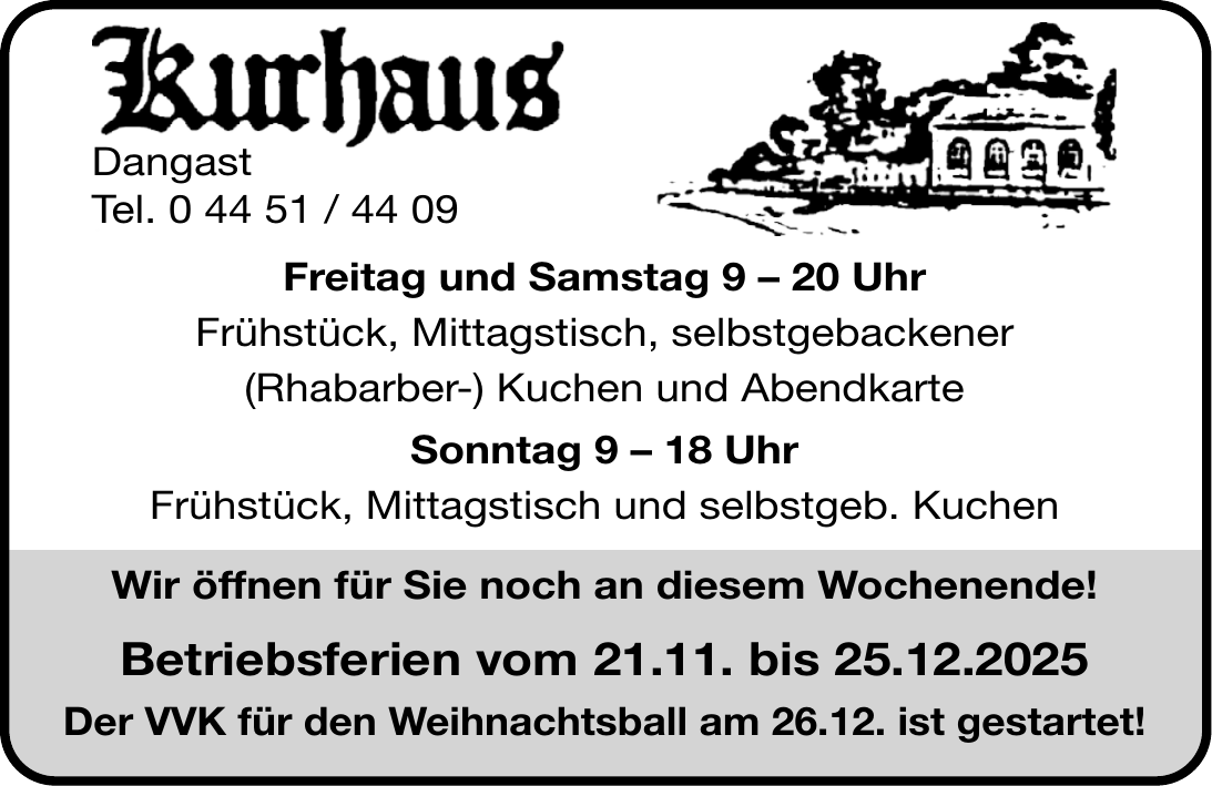 Das Kurhaus Dangast ist ein gastronomischer Familienbetrieb mit Öffnungszeiten von Freitag bis Samstag 9–20 Uhr und Sonntag/Feiertage 9–18 Uhr. Es bietet Frühstück, Mittag- und Abendessen sowie Kuchen und Kaffee. Reservierungen sind unter 04451 4409 möglich, telefonische Erreichbarkeit besteht Do–So.
