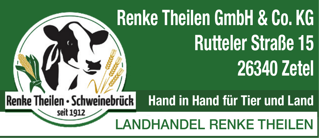 Landhandel Renke Theilen GmbH & Co. KG führt Kraftfutter, Rohwaren, Dünger, Silofolien, Silonetze, Stretchfolien, Silosandsäcke, Milchpulver, Mineralstoffe, Leckmassen, Saatgut (Grassaat, Getreide, Zwischenfrüchte, Mais), Pflanzenschutzmittel, Düngerkalke mit der Möglichkeit zum Leihen eines Streuers, Futterkalke und Einstreukalke sowie Sackware.