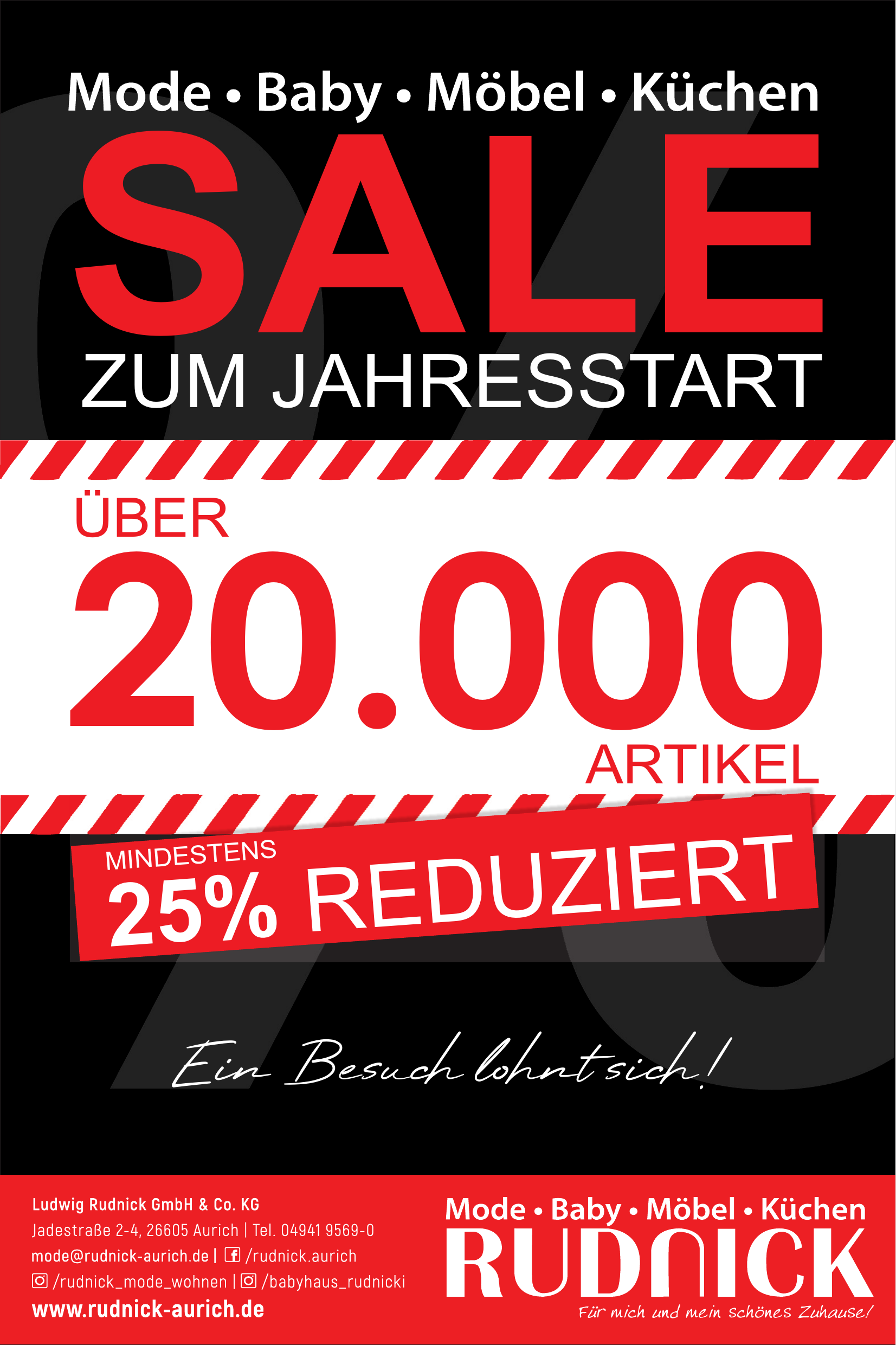 Ludwig Rudnick GmbH & Co. KG betreibt drei Häuser in Aurich – Modehaus, Babyhaus und Möbel‑ & Küchen‑Haus – mit insgesamt über 15.000 m² Fläche. Parkplätze befinden sich direkt vor jedem Haus und der Zugang ist barrierefrei. Das Unternehmen bietet Mode, Babyartikel, Möbel, Küchen sowie Beratung, Lieferung und Montage.