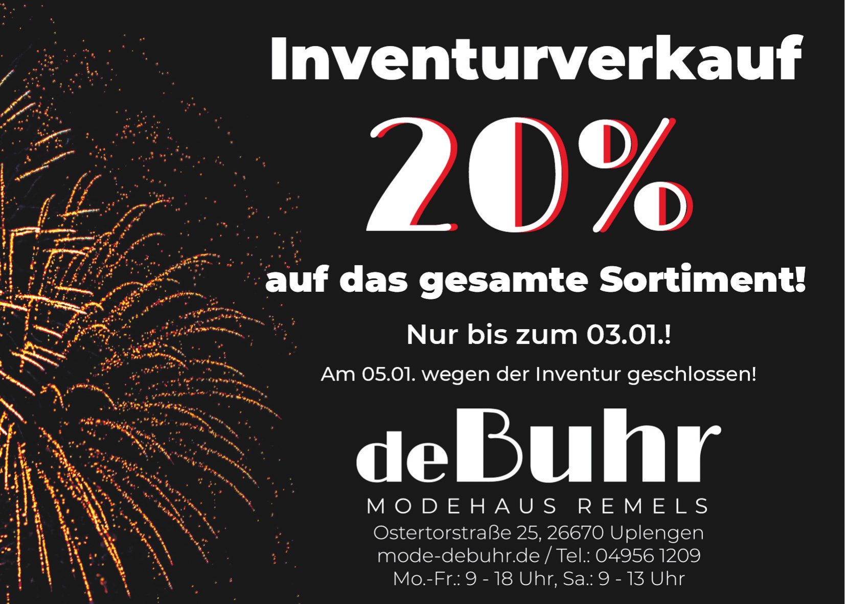Das Modehaus de Buhr befindet sich in der Ostertorstraße 25, 26670 Remels. Zwischen den Jahren sind die Öffnungszeiten Montag bis Freitag von 9 bis 18 Uhr und samstags von 9 bis 13 Uhr.