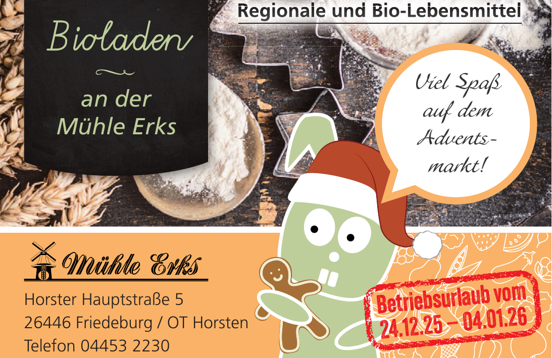 Mühle Erks bietet eine Auswahl an Bio-Mehl, Backmischungen, Getreide, Flocken, Backzutaten, Backformen und Haushaltsmühlen. Die Produkte stammen aus zertifiziertem ökologischen Landbau und sind in einem Naturkostladen sowie im Onlineshop erhältlich.
