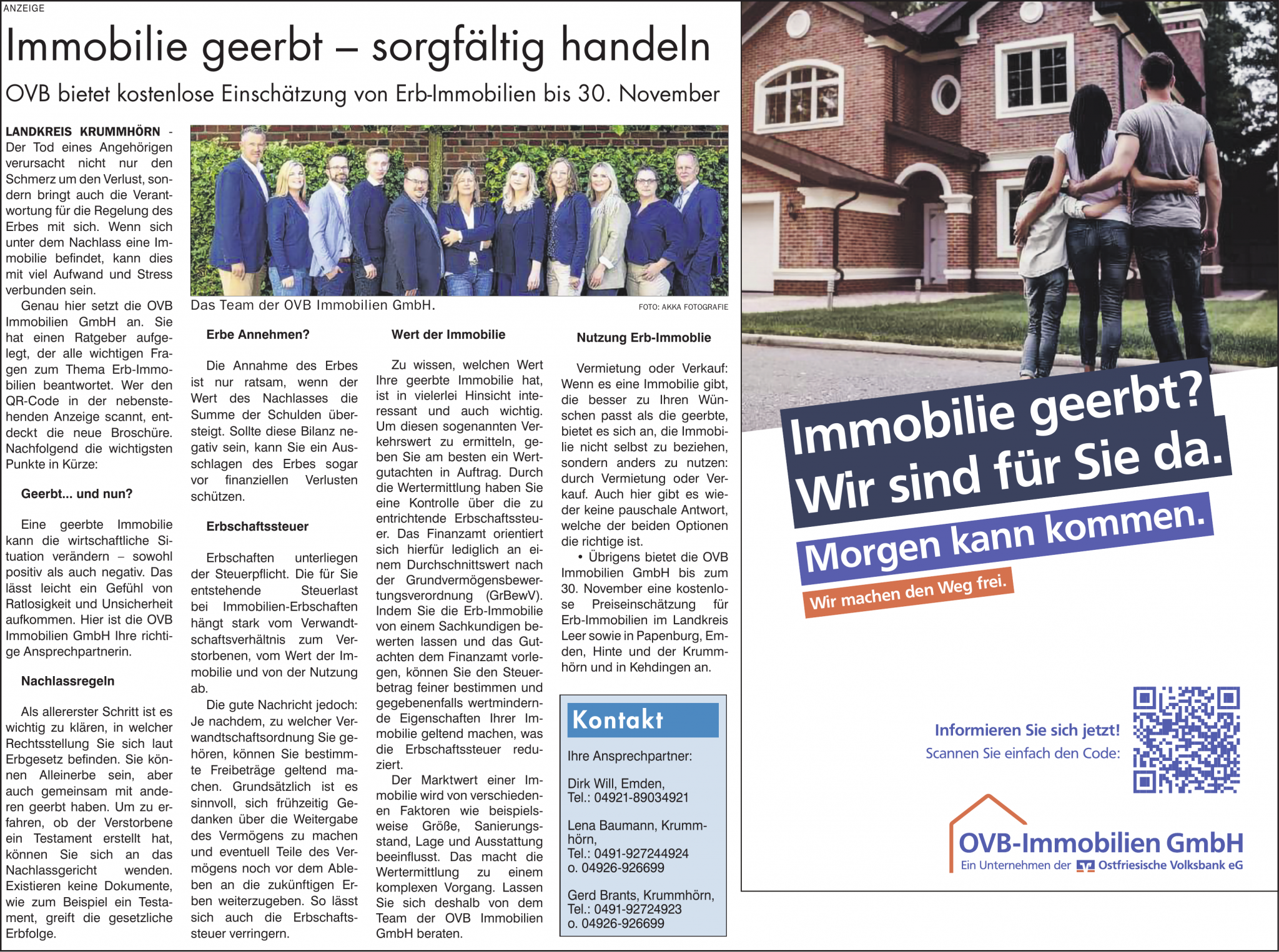 LANDKREIS KRUMMHÖRN - Der Tod eines Angehörigen verursacht nicht nur den Schmerz um den Verlust, sondern bringt auch die Verantwortung für die Regelung des Erbes mit sich. Wenn sich unter dem Nachlass eine Immobilie befindet, kann dies mit viel Aufwand und Stress verbunden sein. Genau hier setzt die OVB Immobilien GmbH an. Sie hat einen Ratgeber aufgelegt, der alle wichtigen Fragen zum Thema Erb-Immobilien beantwortet. Wer den QR-Code in der nebenstehenden Anzeige scannt, entdeckt die neue Broschüre. Nachfolgend die wichtigsten Punkte in Kürze: