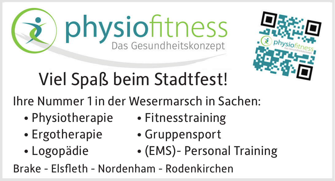 Die Standorte von physiofitness befinden sich in Brake, Nordenham, Elsfleth und Stadland-Rodenkirchen. Dort werden Leistungen wie Physiotherapie, Ergotherapie, Logopädie, Osteopathie, Heilpraktiker, Fitness- und Gesundheitstraining sowie EMS-Training angeboten.