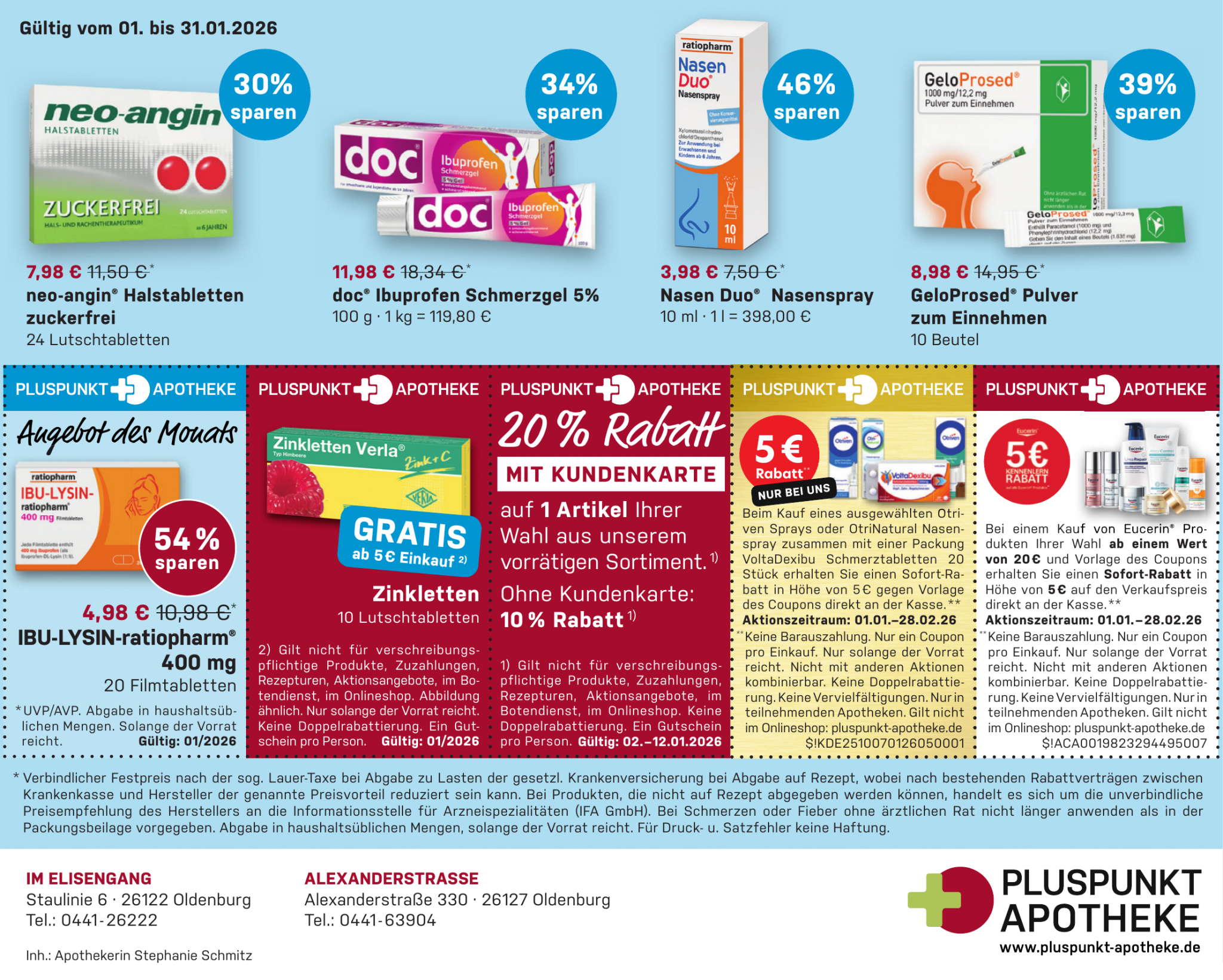 Pluspunkt Apotheke vor Ort bietet regelmäßig wechselnde Angebote, Coupons, Prämien und Boni auf große Teile des Sortiments. Zudem können Kunden ihre Rezepte online hochladen, Medikamente bequem bestellen und sich über Gesundheitsratgeber, Tipps und aktuelle Themen informieren.