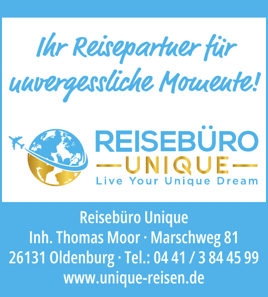 Das Reisebüro Unique in Oldenburg bietet persönliche Beratung, Online-Buchungen, individuelle Reiseangebote, Unterstützung bei der Auswahl der passenden Reise, sowie Zusatzleistungen wie Reiseversicherungen, Flughafentransfers, Flughafenlounges, Parkmöglichkeiten am Flughafen und Tauchen an.