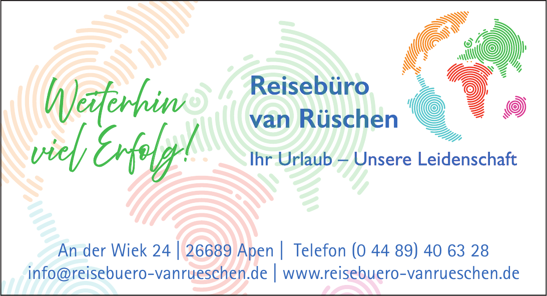 Das Reisebüro arbeitet mit renommierten Partnern zusammen und ist unter anderem mit der Schmetterling Vorteilskarte und dem SMG-Partner-Badge zertifiziert. Diese Auszeichnungen stehen für hohe Qualitätsstandards und ein weitreichendes Netzwerk. Der Leitspruch „So weit das Auge reicht“ verdeutlicht die Vielfalt der Angebote – von beliebten Destinationen wie Griechenland und Ägypten bis hin zu individuell gestalteten Urlaubsreisen. Die zentrale Lage in Apen macht van Rüschen zur ersten Adresse für Reisewünsche in der Region.