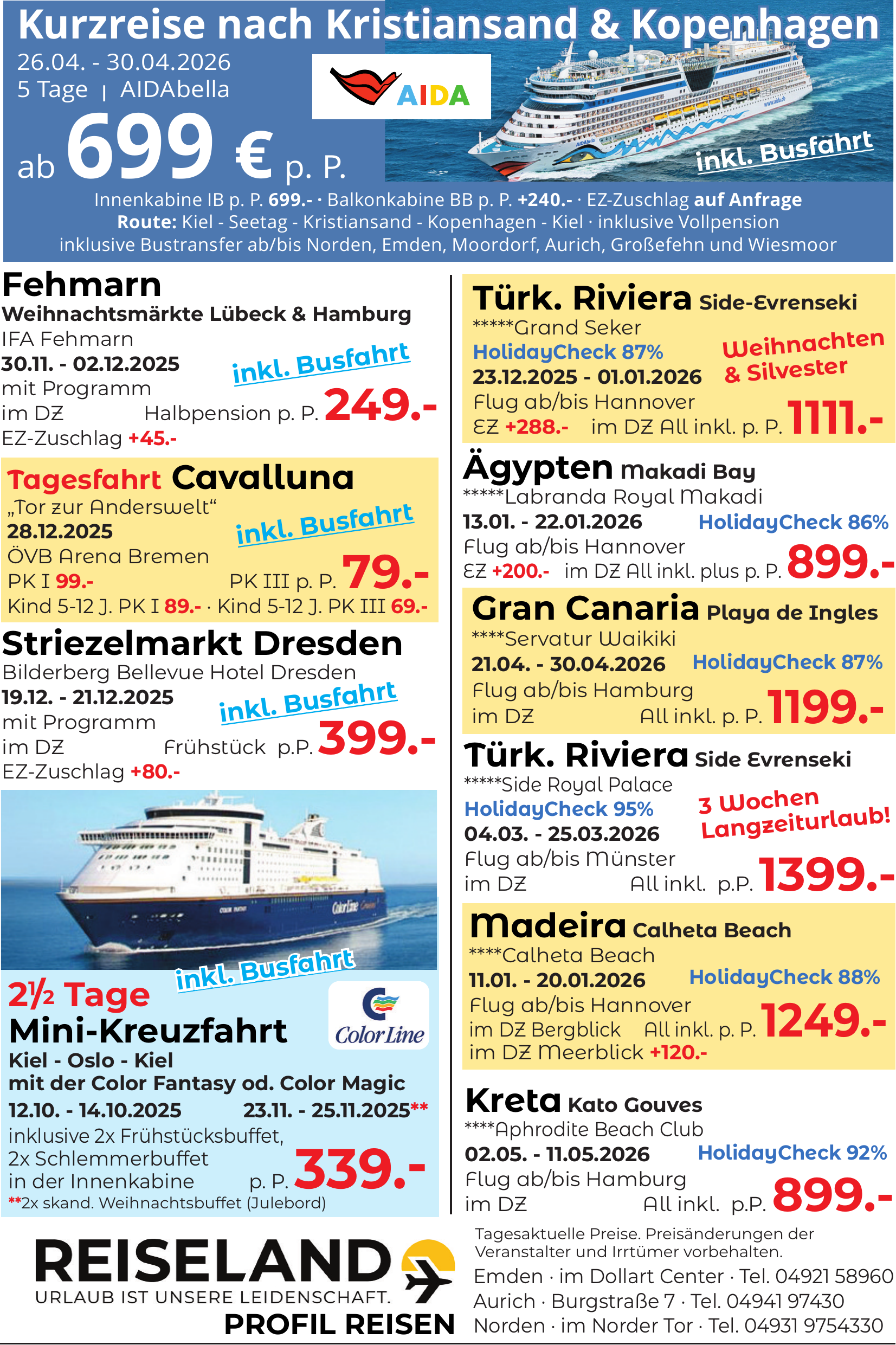 Reiseland Profil Reisen in Aurich bietet eine persönliche Beratung für Traumurlaube, Gruppenreisen, Pauschalreisen, Kreuzfahrten, Städtereisen, Fernreisen, Schiffsreisen, Busreisen, Familienreisen und mehr. Die Experten vor Ort beraten individuell und helfen bei der Planung, Buchung und Organisation Ihrer Reise.